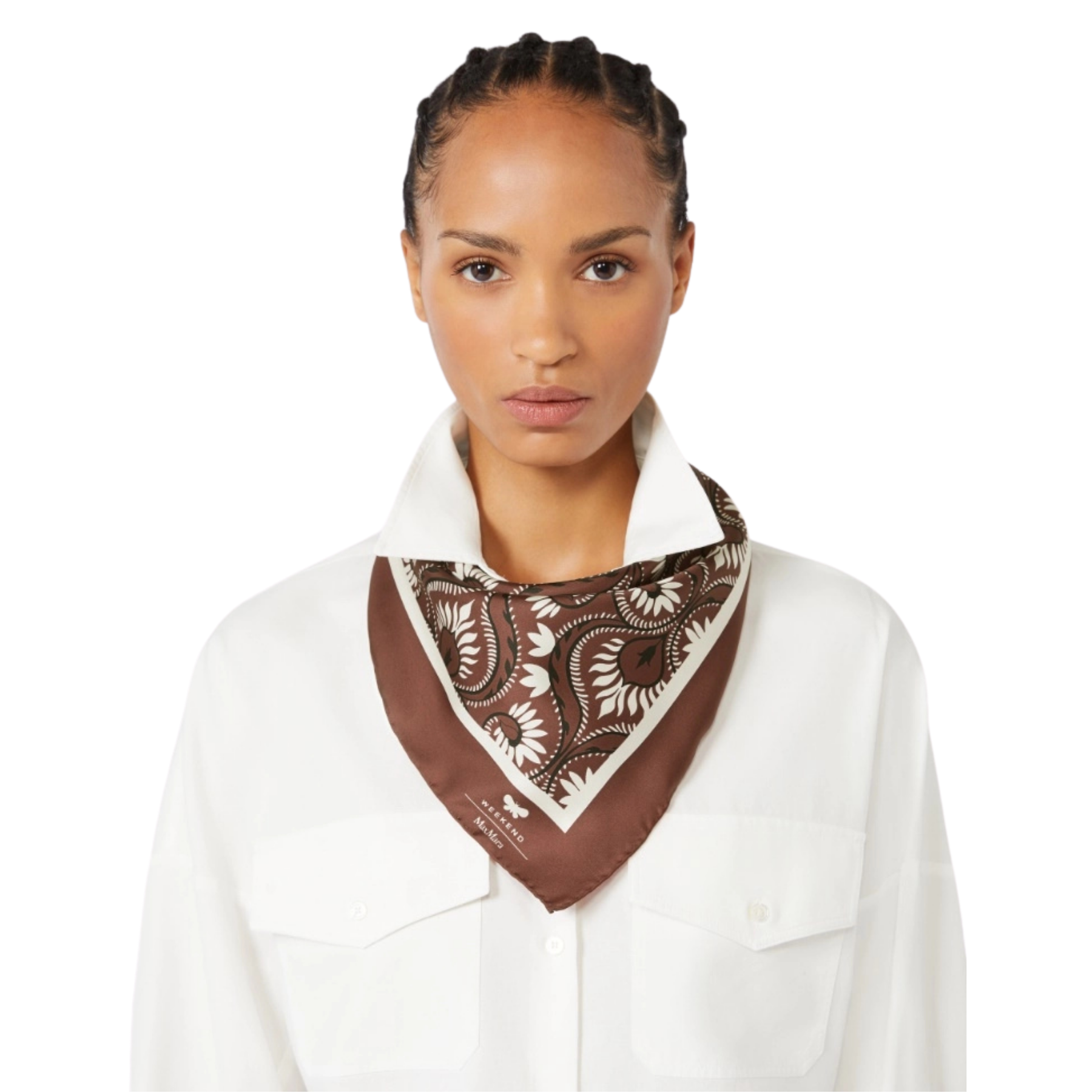 Et luksuriøst silkeskjerf i 100% twill-silke, med et mønster hentet fra Max Maras ikoniske kolleksjon. Skjerfet har delikat stikning langs kantene og en subtil Weekend Max Mara-logo nederst i høyre hjørne. Med sine mål på 90 × 90 cm er det perfekt til å style både hverdags- og festantrekk, og tilfører en sofistikert og elegant detalj til ethvert look.