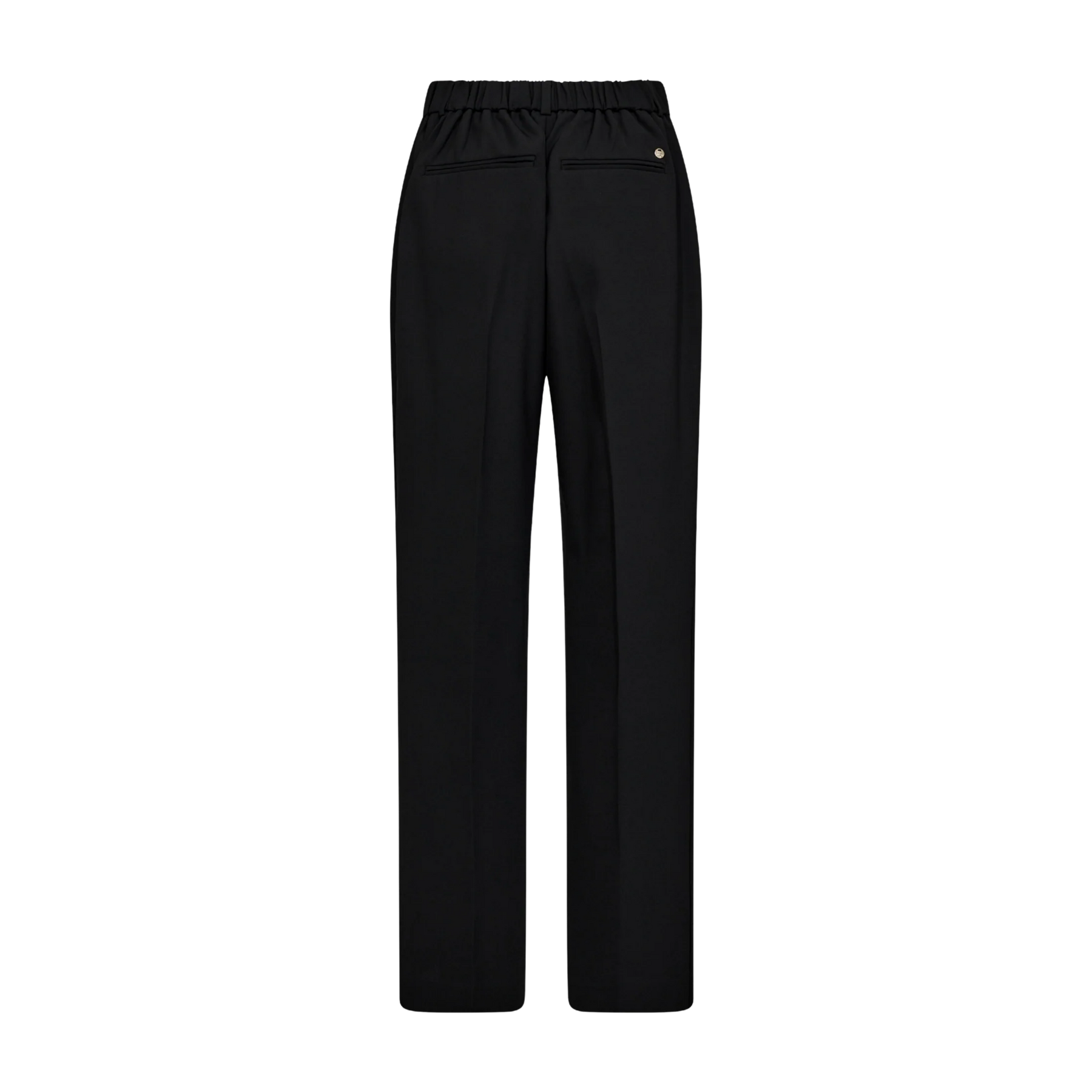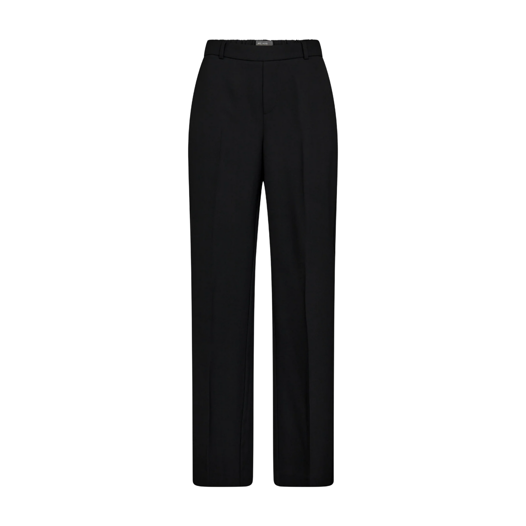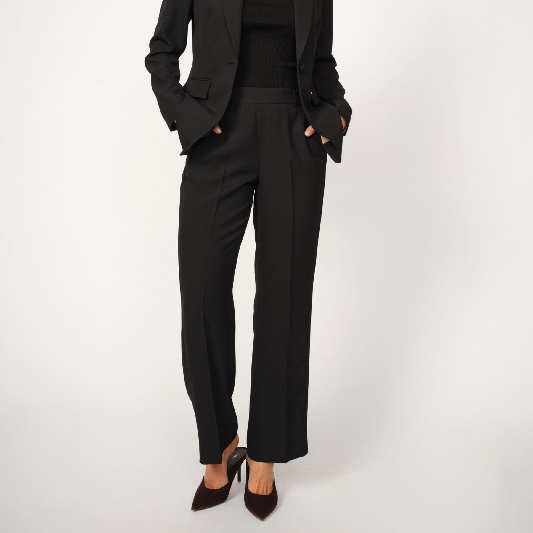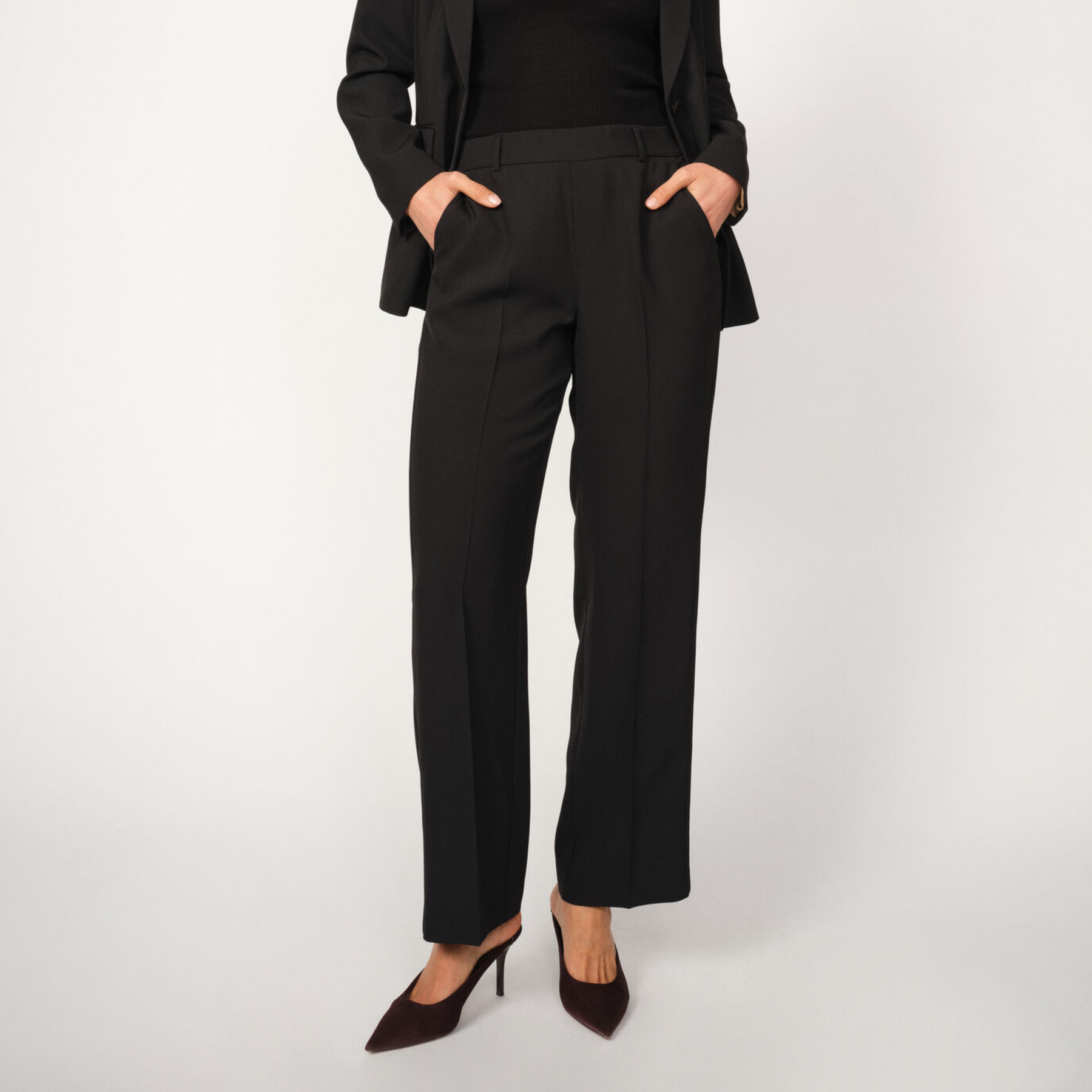 En klassisk sort dressbukse med rett passform og middels til høyt liv som gir en flatterende og stilren silhuett. Buksen har ankellengde, nøye pressede legg og skjult glidelås, noe som gir et polert og gjennomført uttrykk.