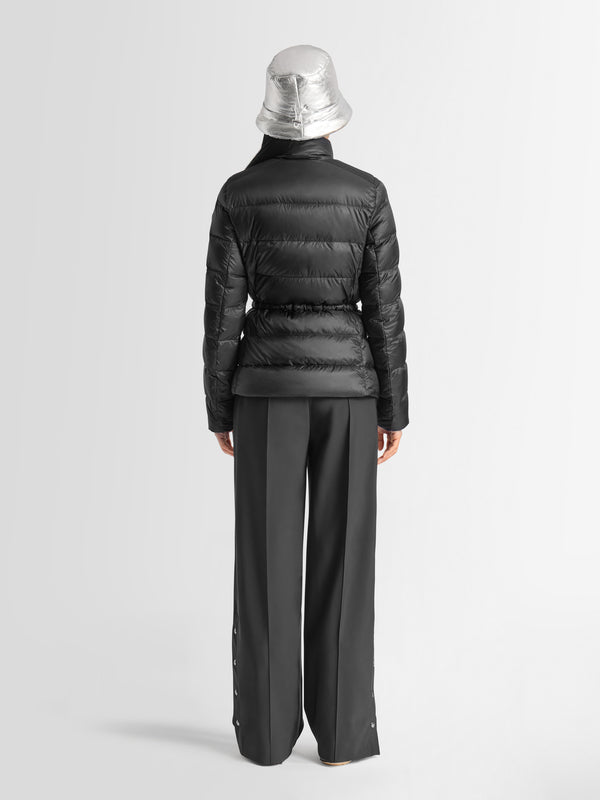 Kerin dunjakken utmerker seg med sin feminine og glamorøse silhuett. Laget av vannavvisende teknisk stoff, har den en snøring i midjen, mens skulderforsterkninger gir forbedret beskyttelse. Ekstremt kompakt, denne vatterte dunjakken kan pakkes sammen og oppbevares i en innvendig lomme for enkel transport.
