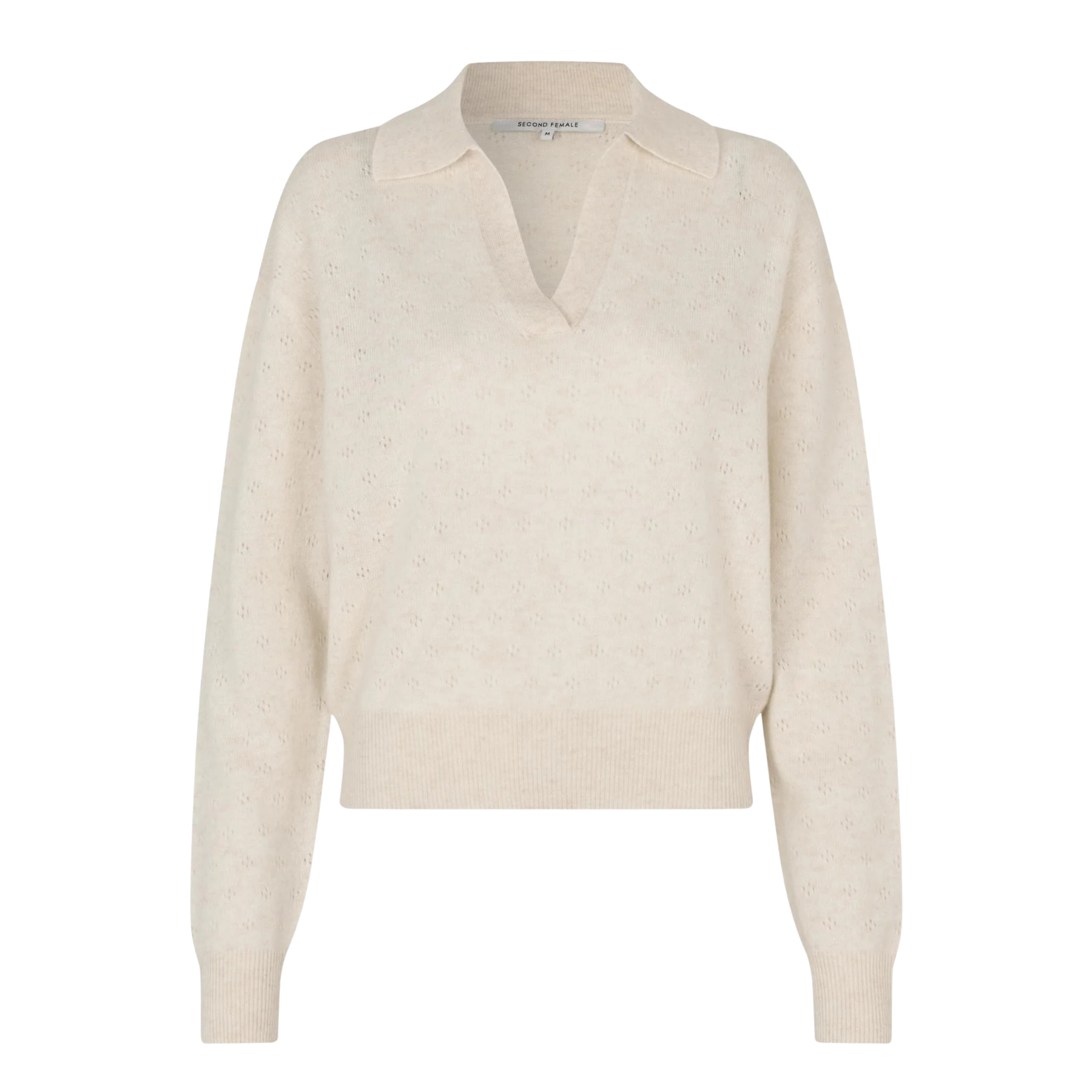 Denne genseren fra Second Female er strikket i en myk ull- og kasjmirblanding som varmer uten å føles tung. Pointelle-mønsteret gir et litt mer levende uttrykk enn en helt glatt strikk, og gjør den fin også når du vil kle deg litt mer opp.