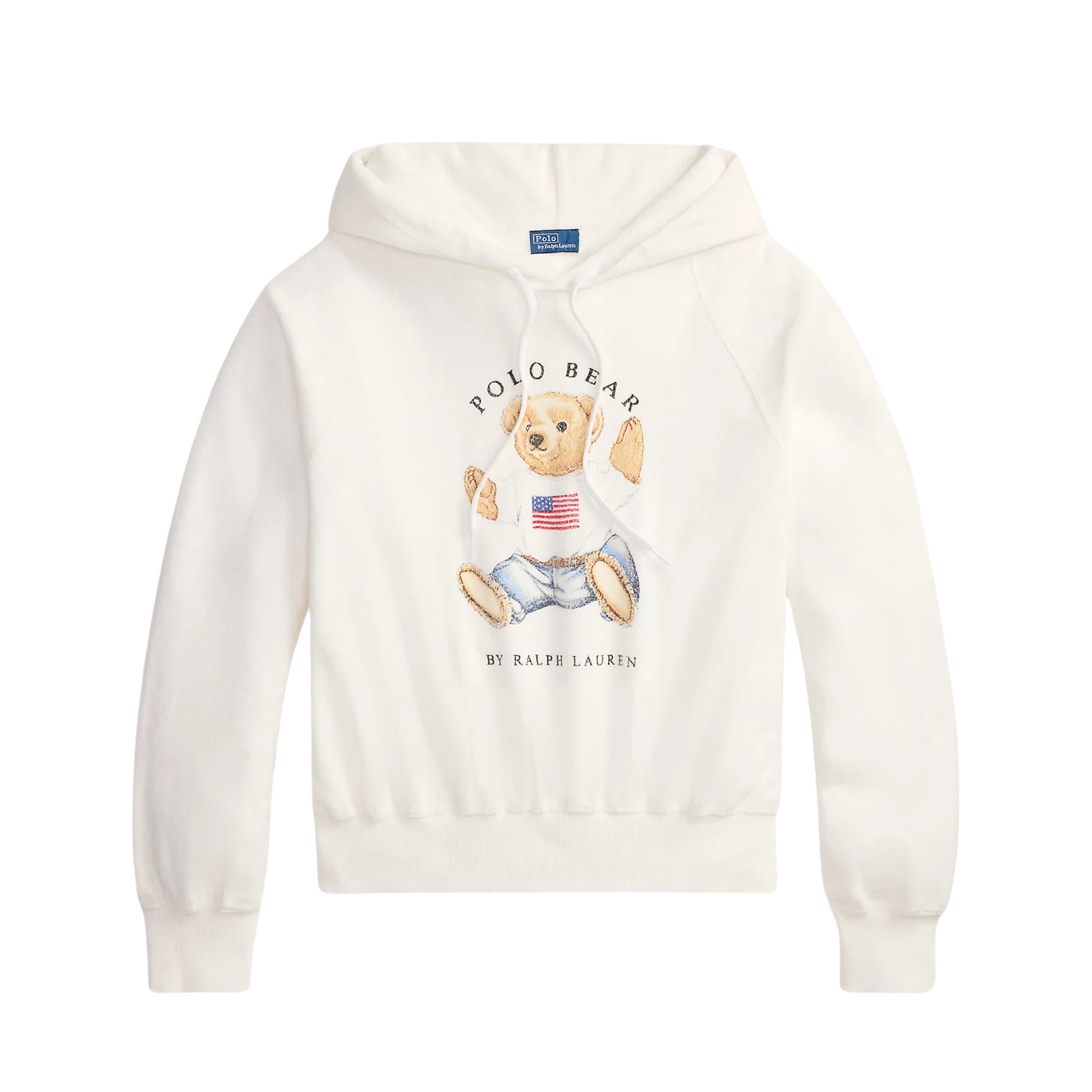 Genseren sitter tett til kroppen og når akkurat til hoften. Hetten er foret og har snøring. Raglanermene er lange med ribbstrikk ved håndleddene. Det ikoniske Polo Bear-motiv trykket på brystet gjør den til et statement-plagg som fungerer både til joggebukser og jeans.