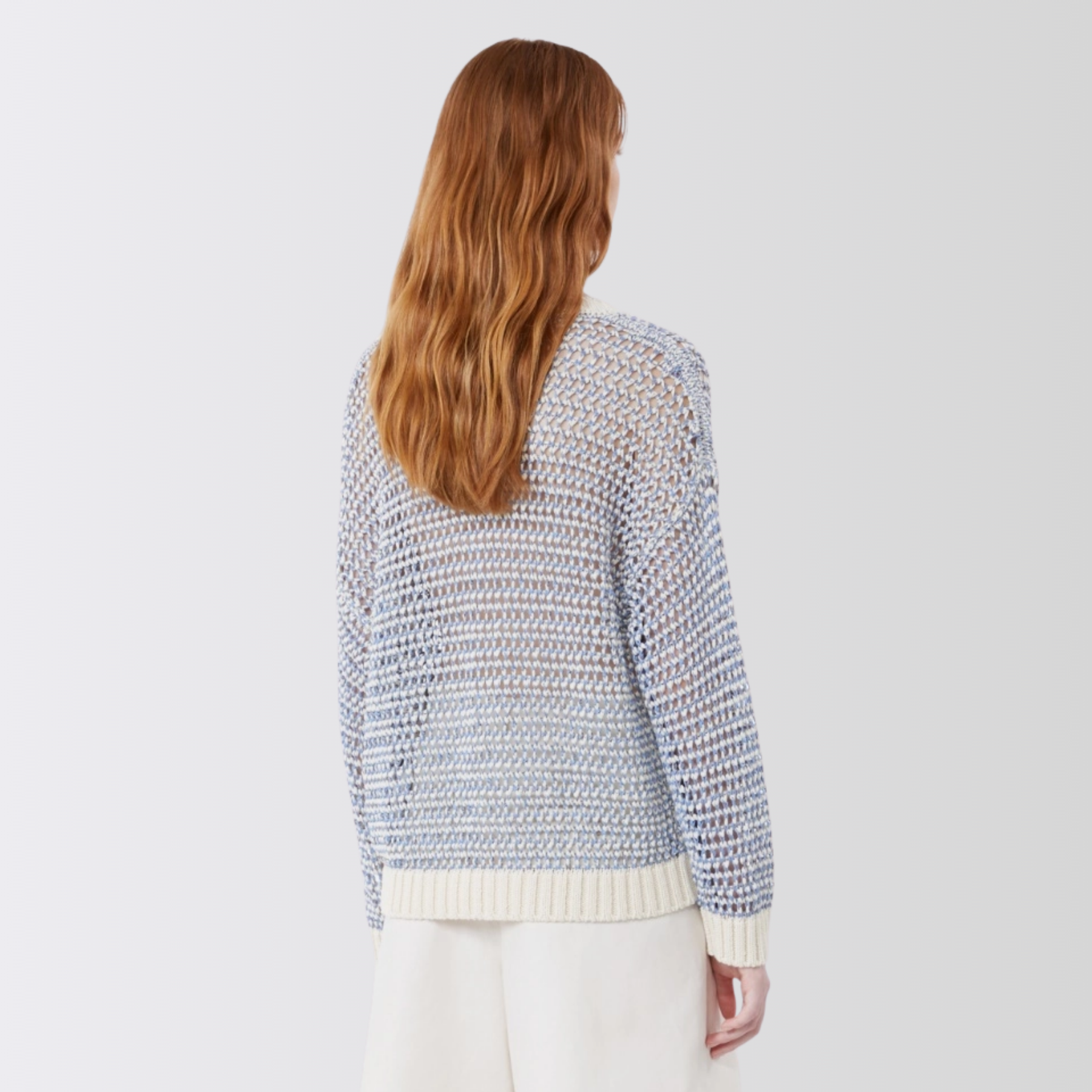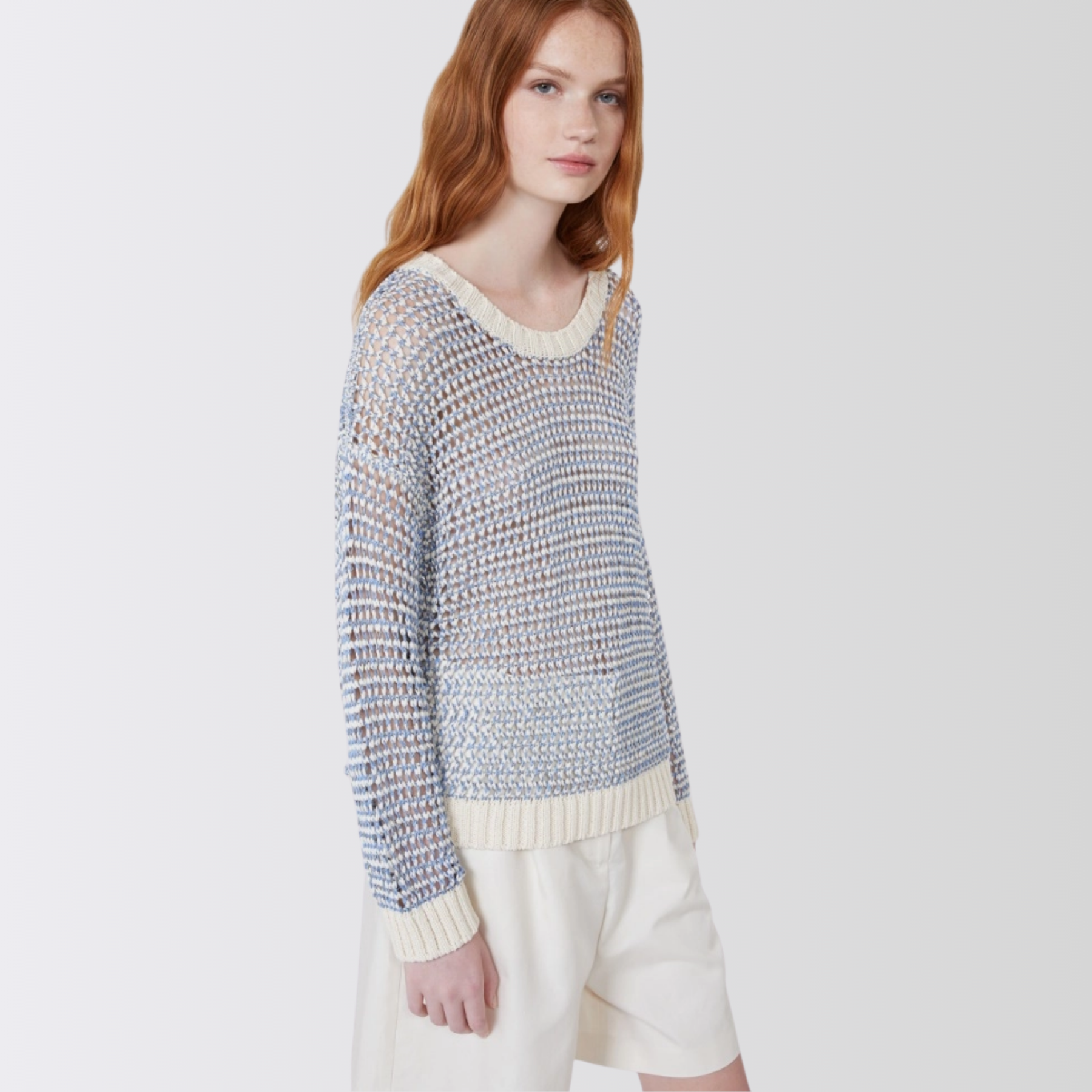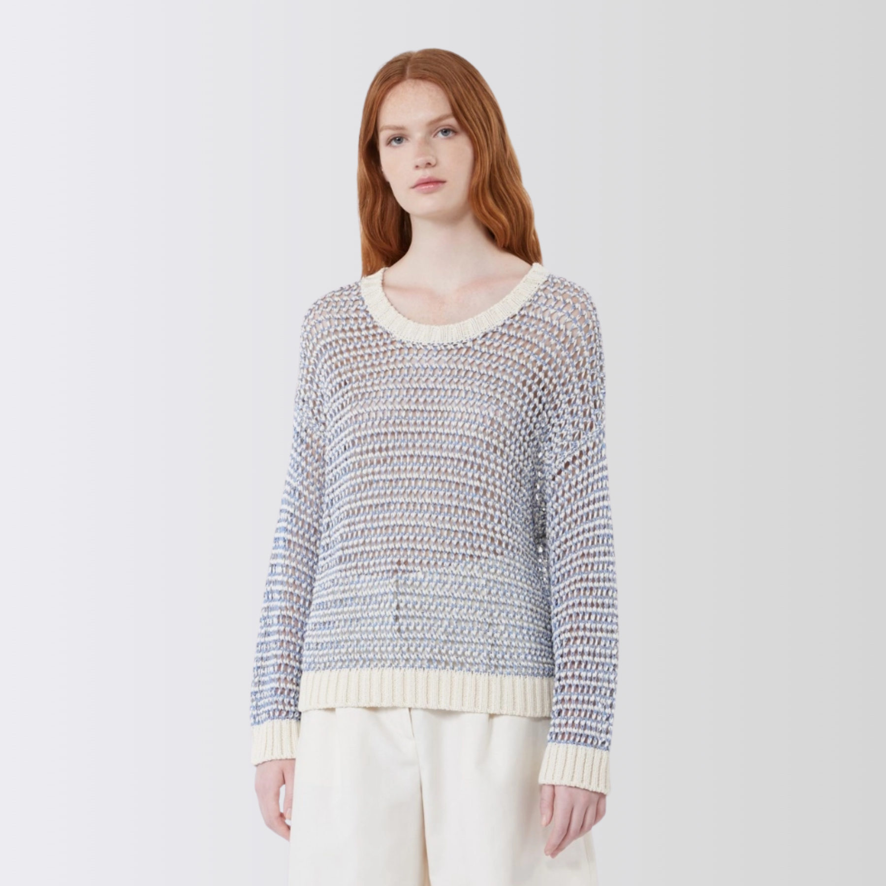 Myk og luftig genser med et lett transparent mesh-uttrykk som gir en moderne og feminin look. Modellen har en oversized passform som faller avslappet på kroppen, og er strikket i en naturlig blanding av lin og bomull for en lett og behagelig følelse.