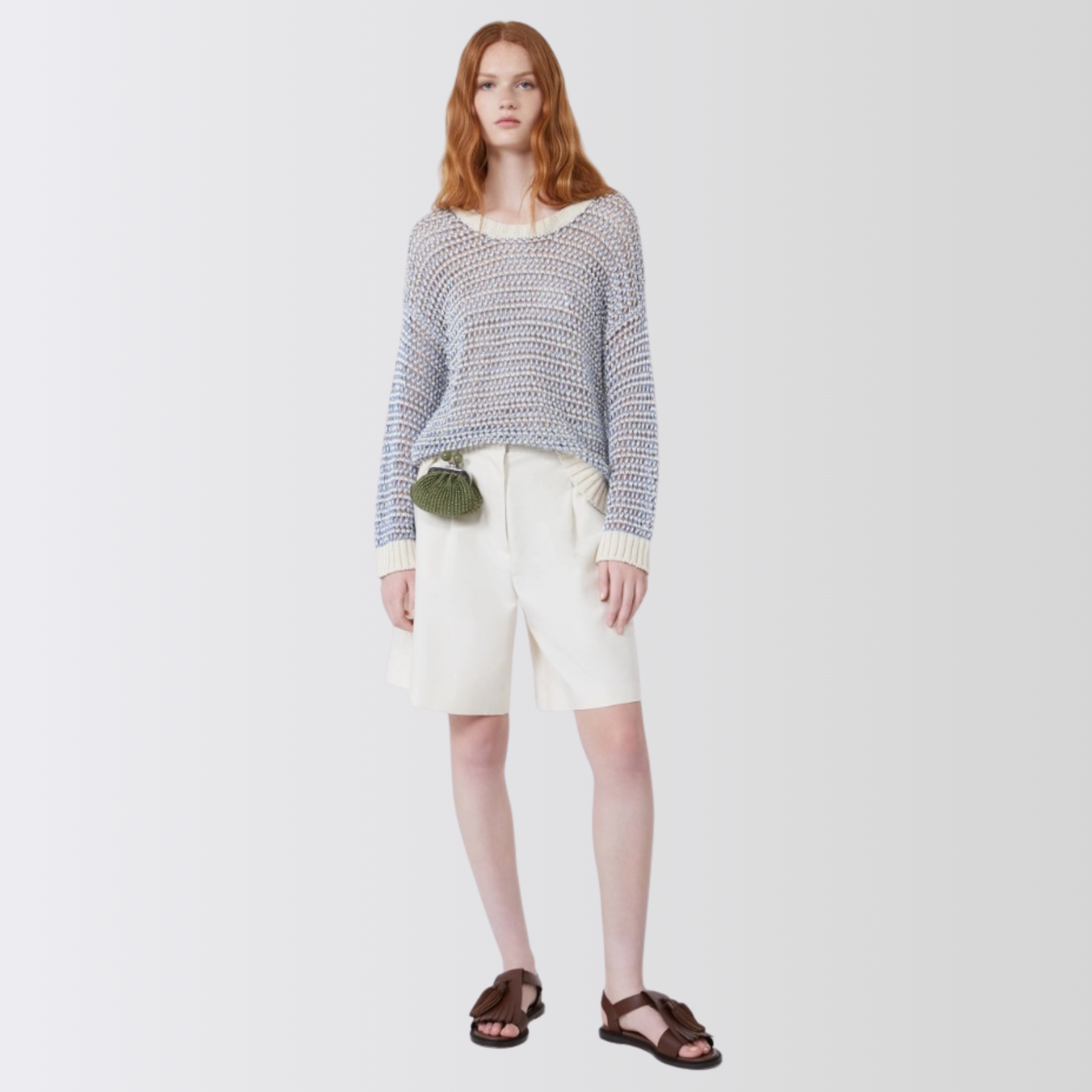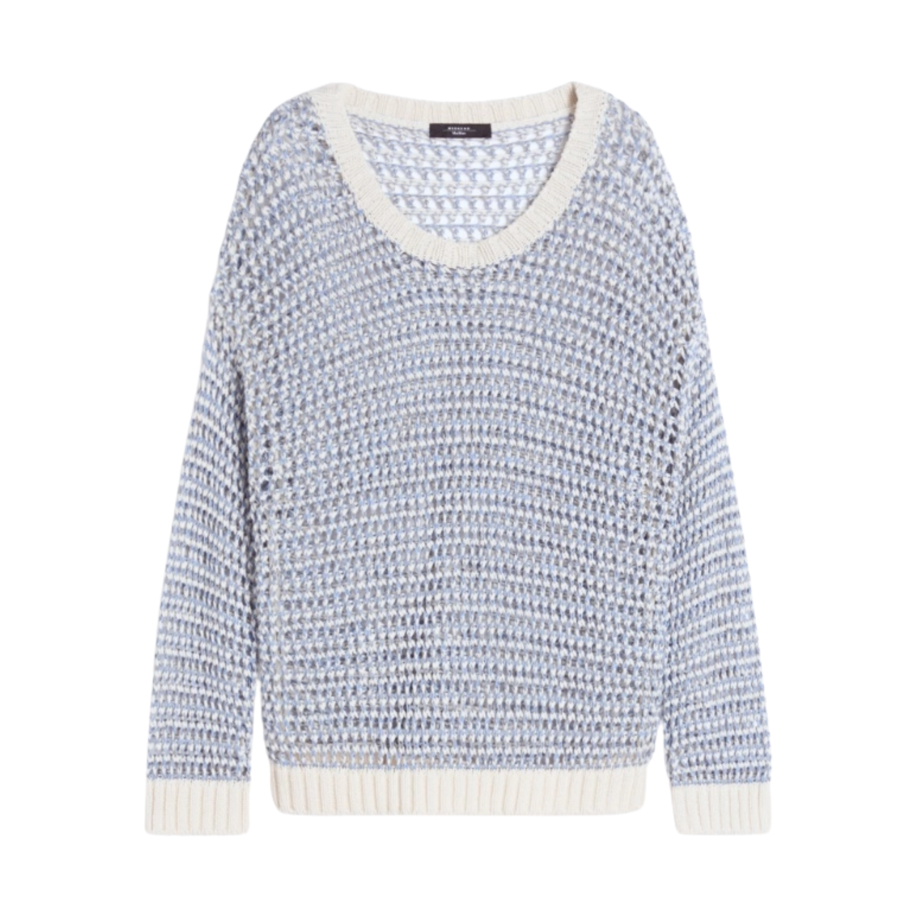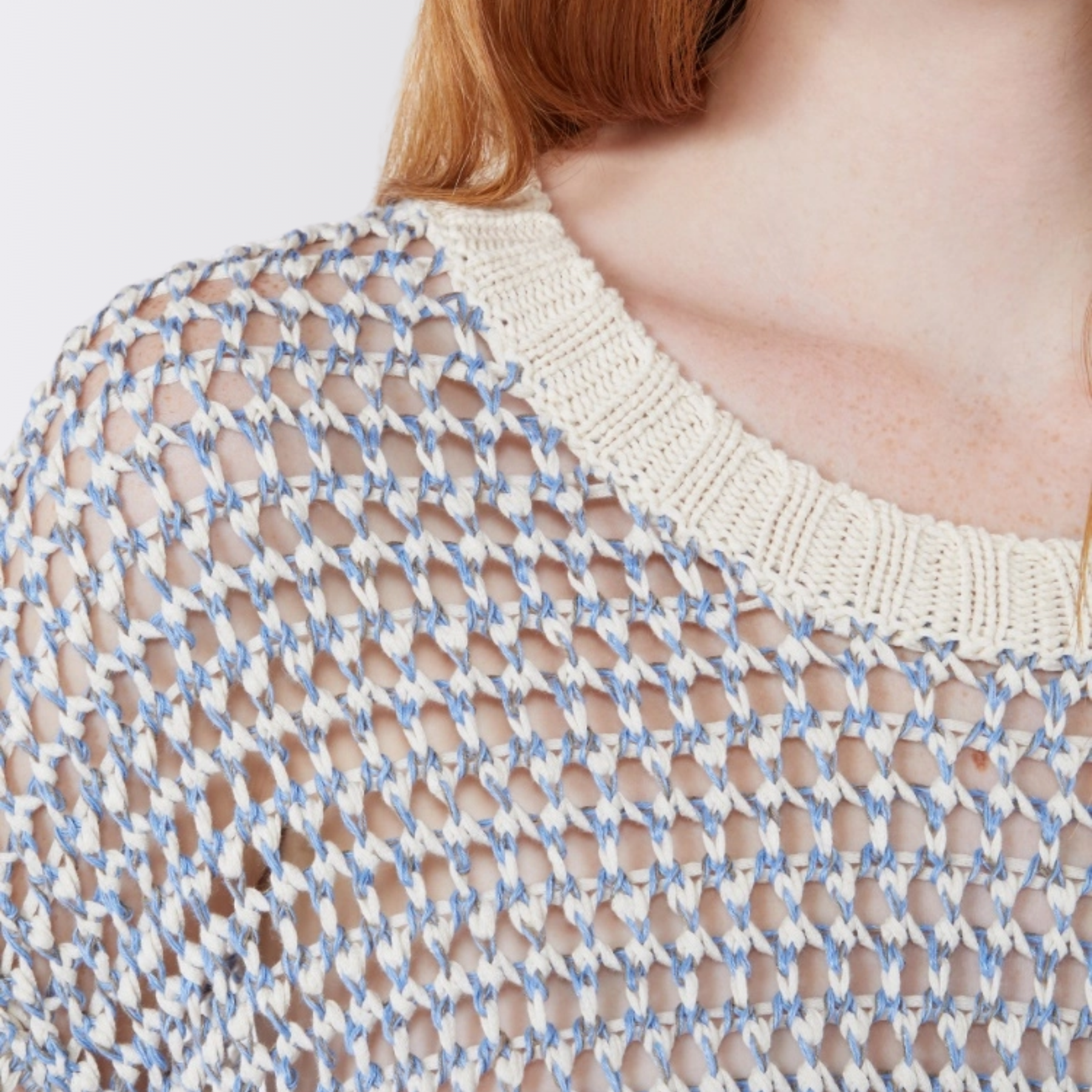 Myk og luftig genser med et lett transparent mesh-uttrykk som gir en moderne og feminin look. Modellen har en oversized passform som faller avslappet på kroppen, og er strikket i en naturlig blanding av lin og bomull for en lett og behagelig følelse.