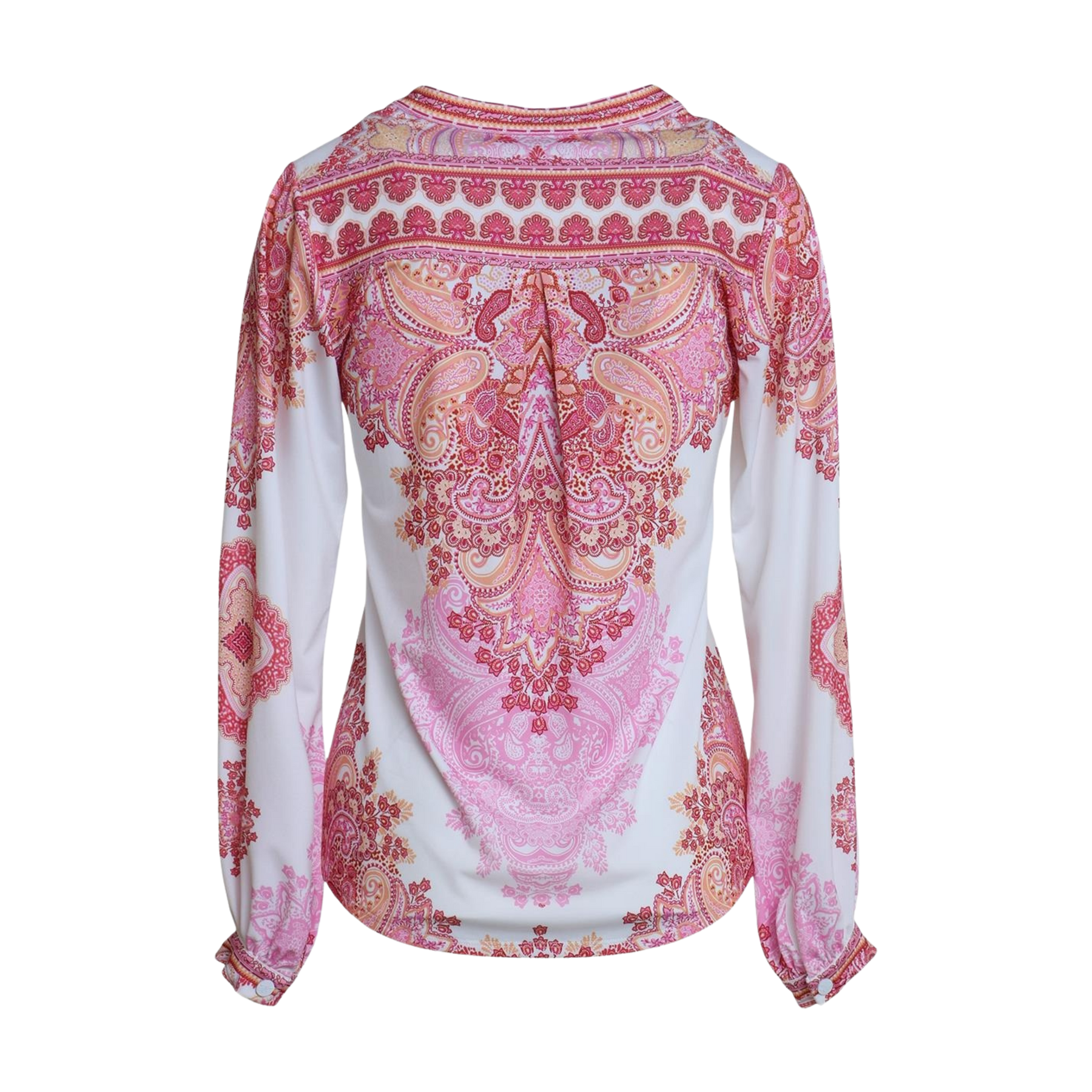 En sofistikert og komfortabel topp i matt jersey (96 % polyester / 4 % spandex) med et mykt og lett fall. Toppen har en V-hals og dekorativt bærestykke med blomsterknapper som gir et feminint og delikat uttrykk.