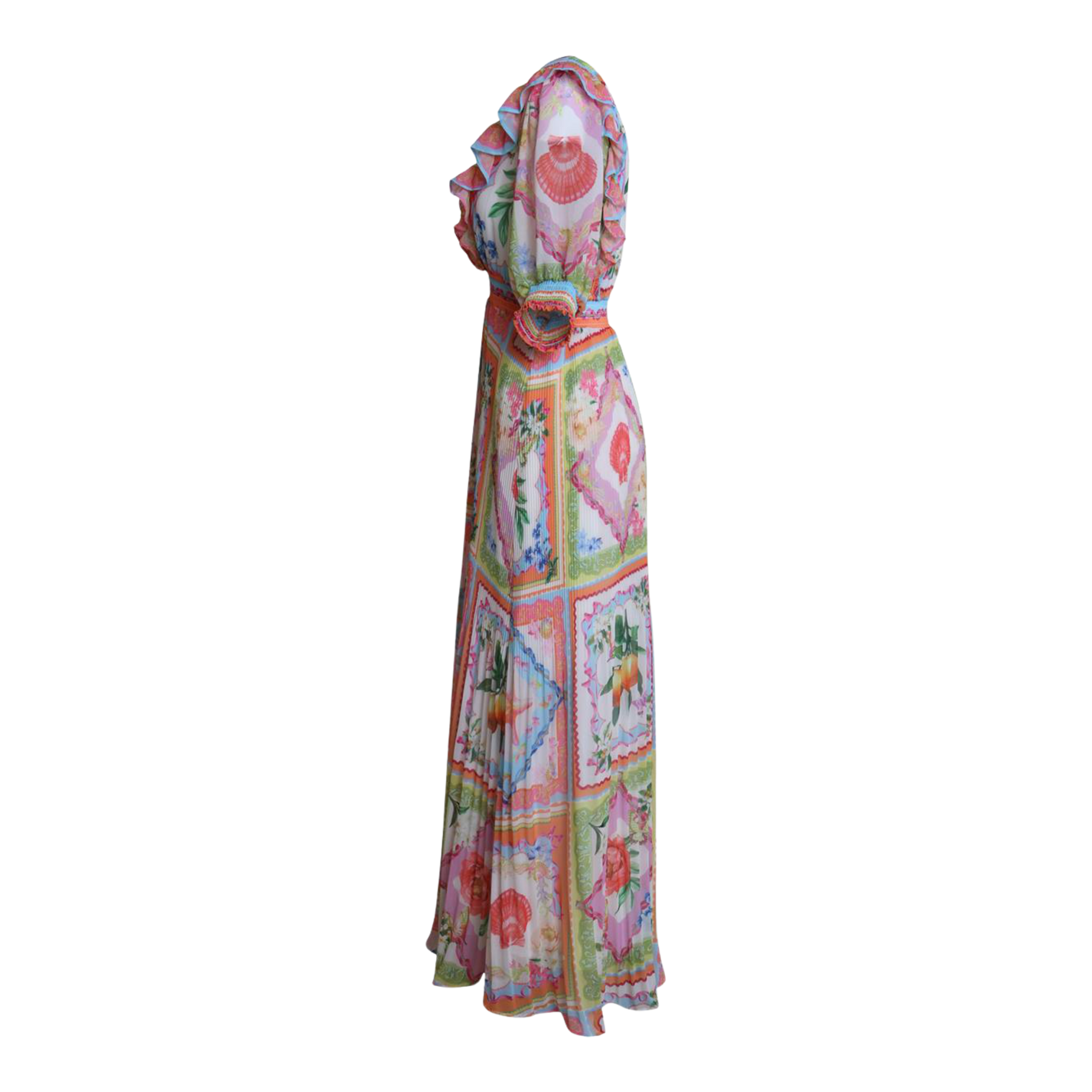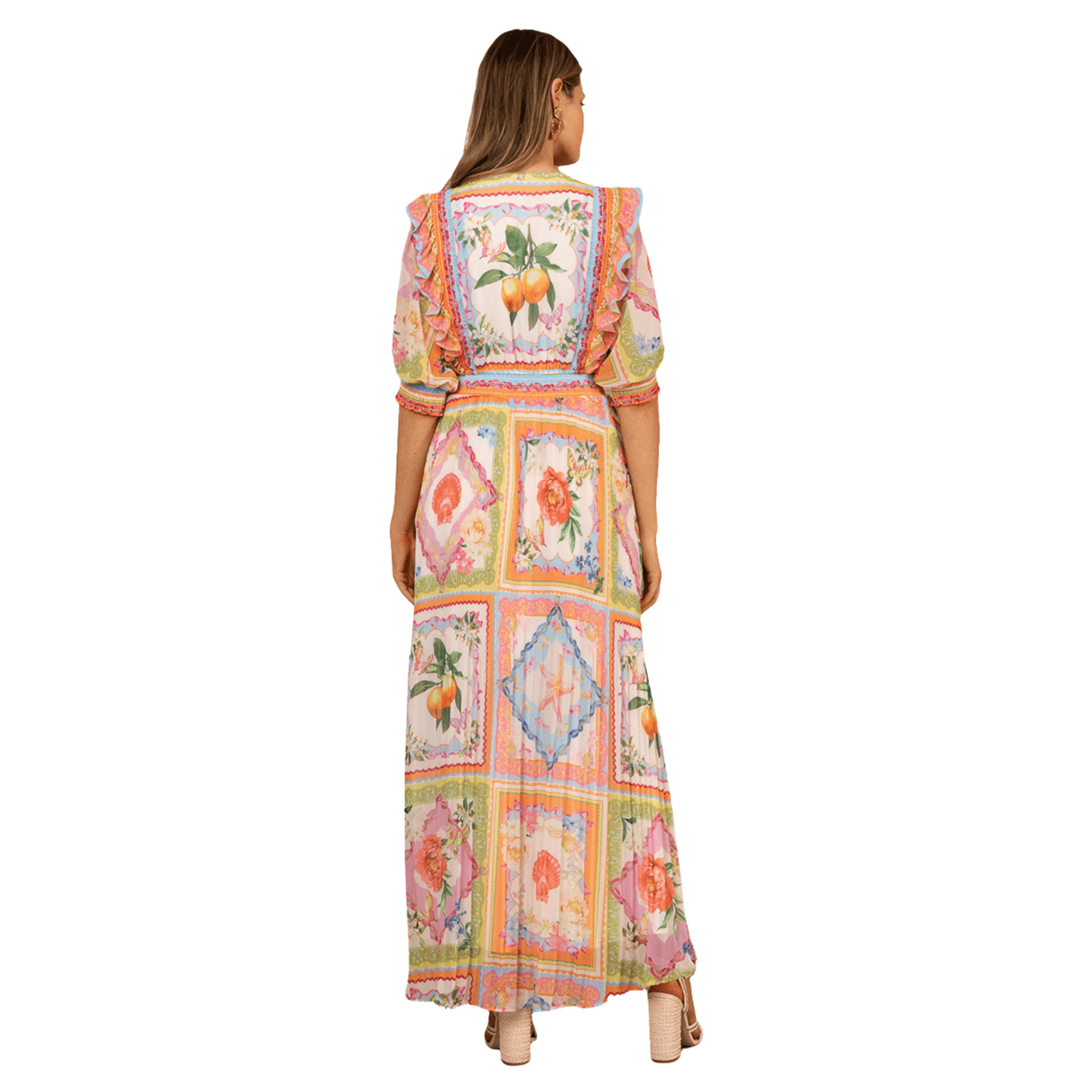 Overdelen er dekorert med smocking og volangdetaljer, mens midjen markeres med elastisk smocking som fremhever silhuetten. Skjørtet er voluminøst og plissert, og skaper bevegelse og et romantisk preg i antrekket.
