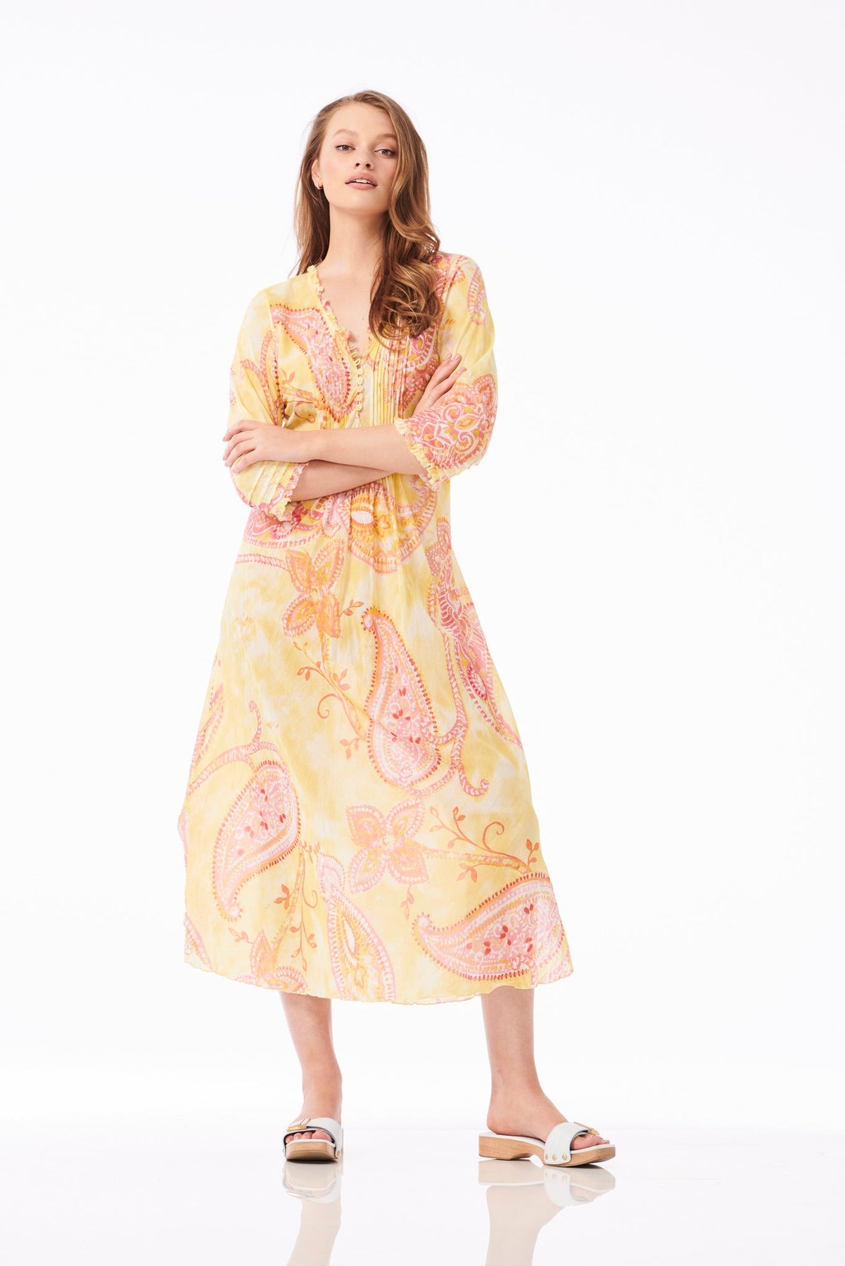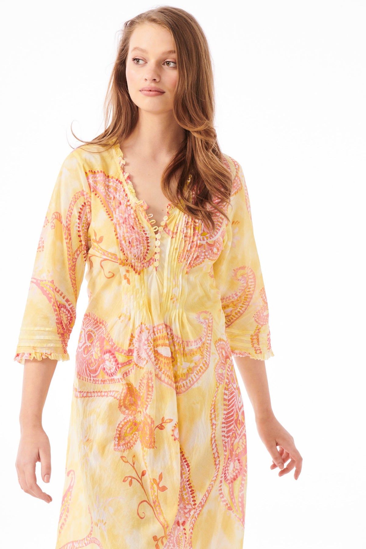 One Season Long Poppy Lemon. Avrundet kant med sidesplitt 3/4 erme 100 % vasket bomull. Kutt på skjevheten Volanger rundt hals og erme. Håndvask, håndtørk og vri for a Crinkled Look. Håndvask i kaldt vann og tørk i skyggen for en mindre krøllet look.