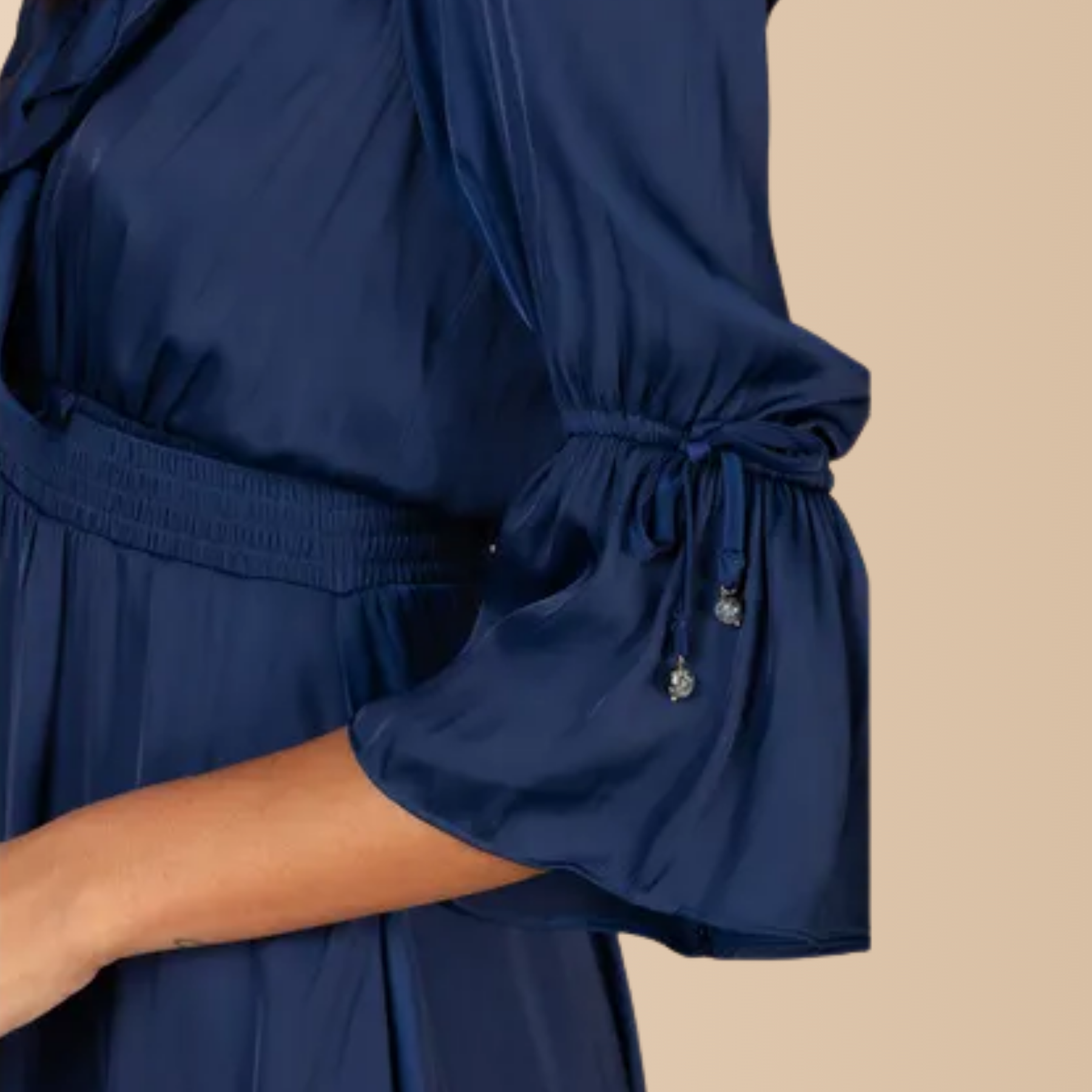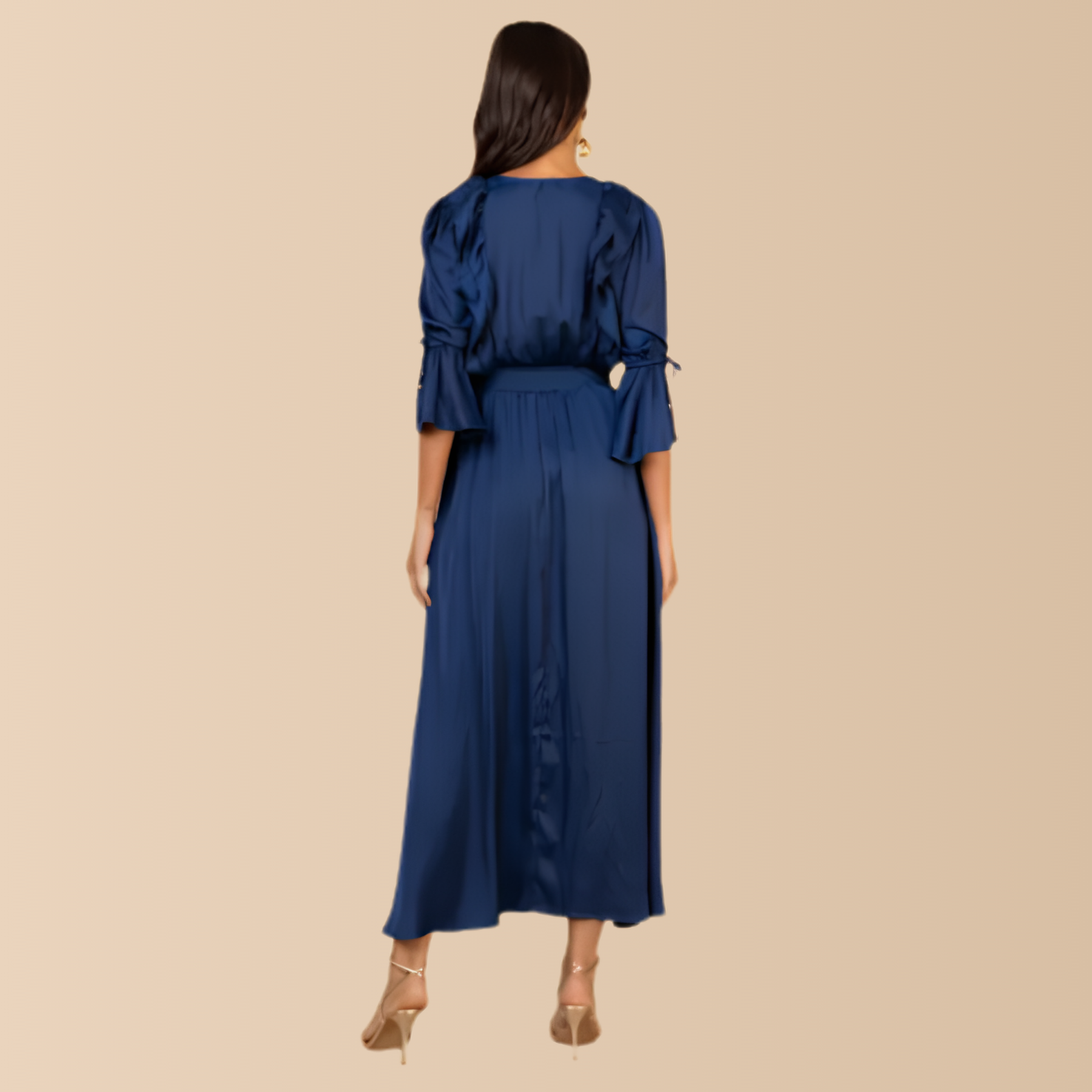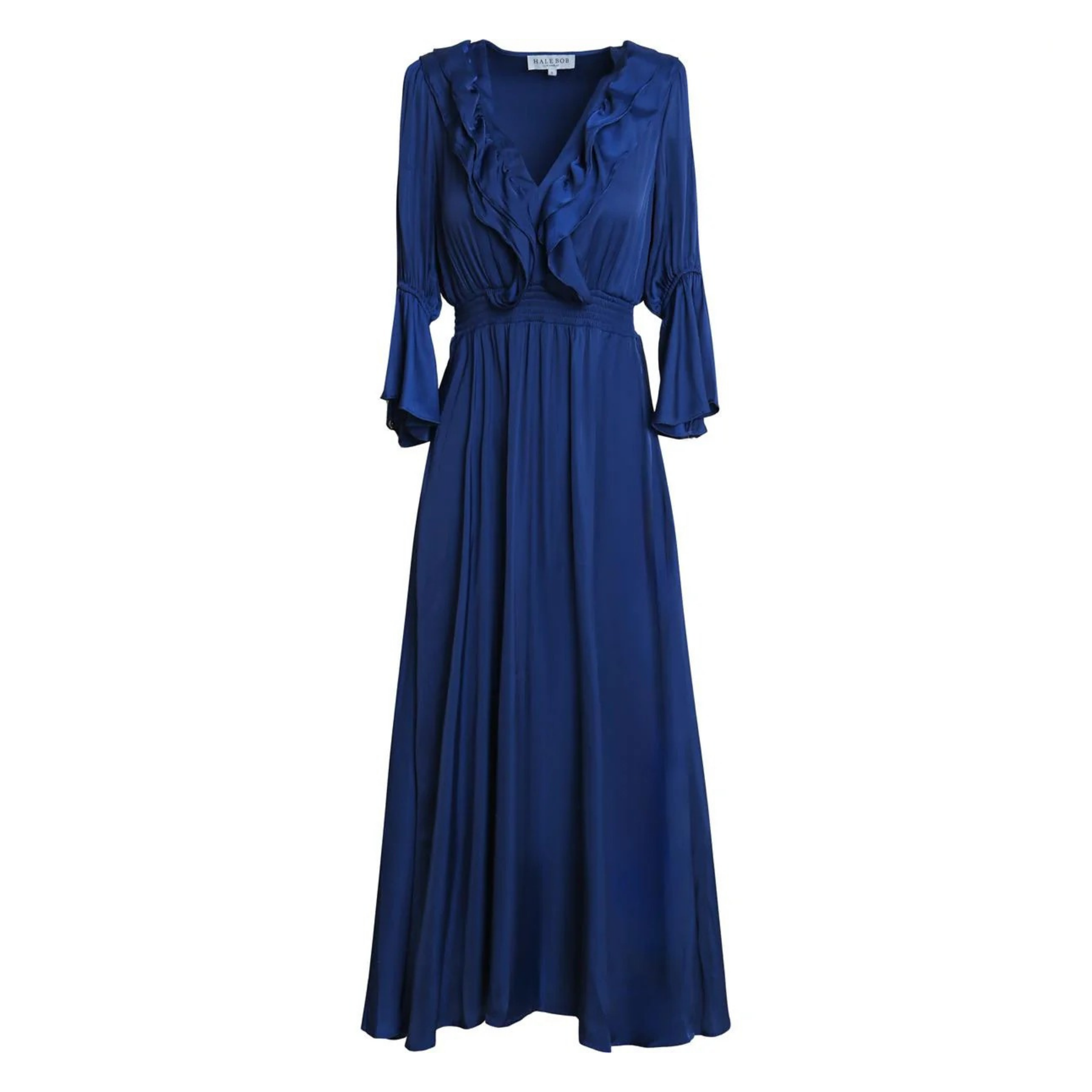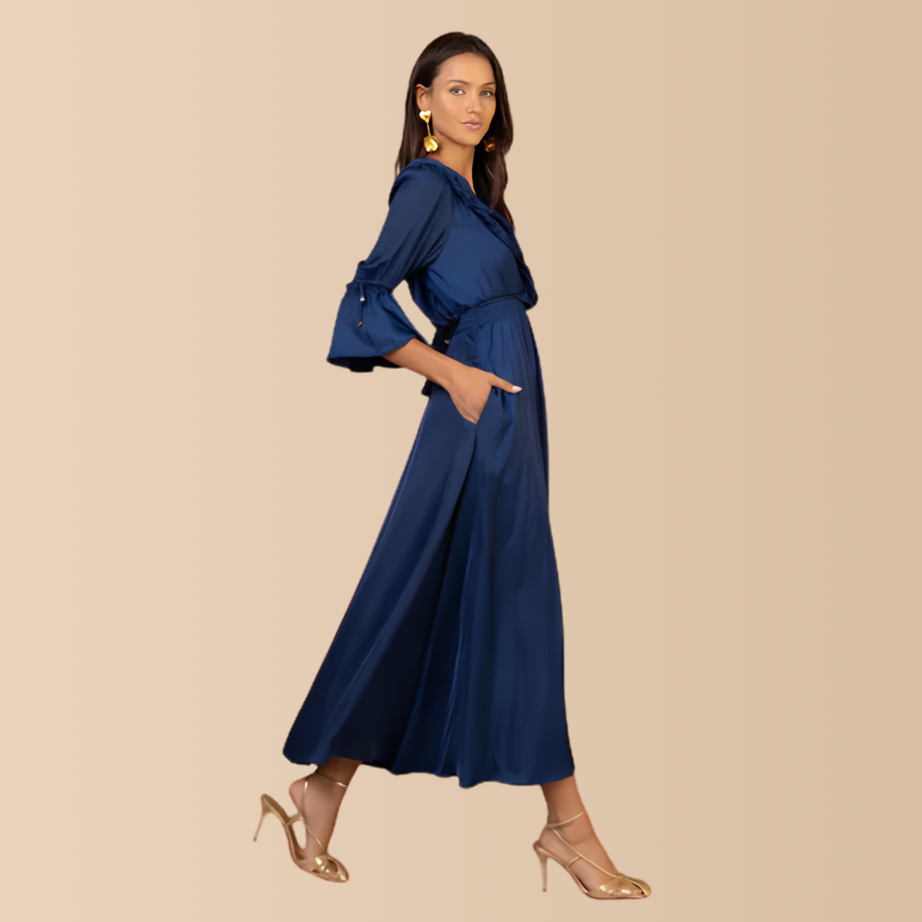 Maxikjole med en lett og feminin silhuett. Modellen har V-hals med volangdetalj i front, som gir et mykt og dekorativt uttrykk. Ermene er korte med flounce-volanger og knyting, som tilfører en leken og elegant finish. Den smockede midjen fremhever fasongen på en behagelig måte, mens det vide skjørtet faller lett og gir god bevegelse. Praktiske lommer i sidene gjør kjolen både funksjonell og anvendelig.