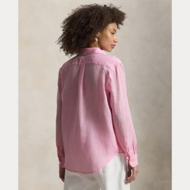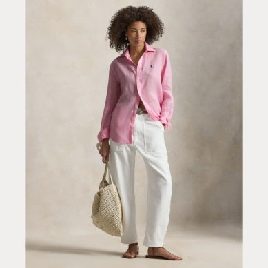 Classic Fit: en rett silhuett. Var ment å treffe ved hoften. Størrelse medium har en frontlengde på 28,25" og ermelengde på 33". Kroppslengde og ermelengde tas fra midt bak på nakken. Ermelengden varierer med 0,75" mellom størrelsene. Punktkrage. Knappet søyle. Skallknapper. Langermet med knappede tønnemansjetter. Boksplissert bakyoke. Skjortehale-fald. Signaturbrodert ponni på venstre bryst. 100 % lin. Maskinvaskbar eller tørrrens. Importert. Modellen er 178 cm høy og bruker størrelse small.