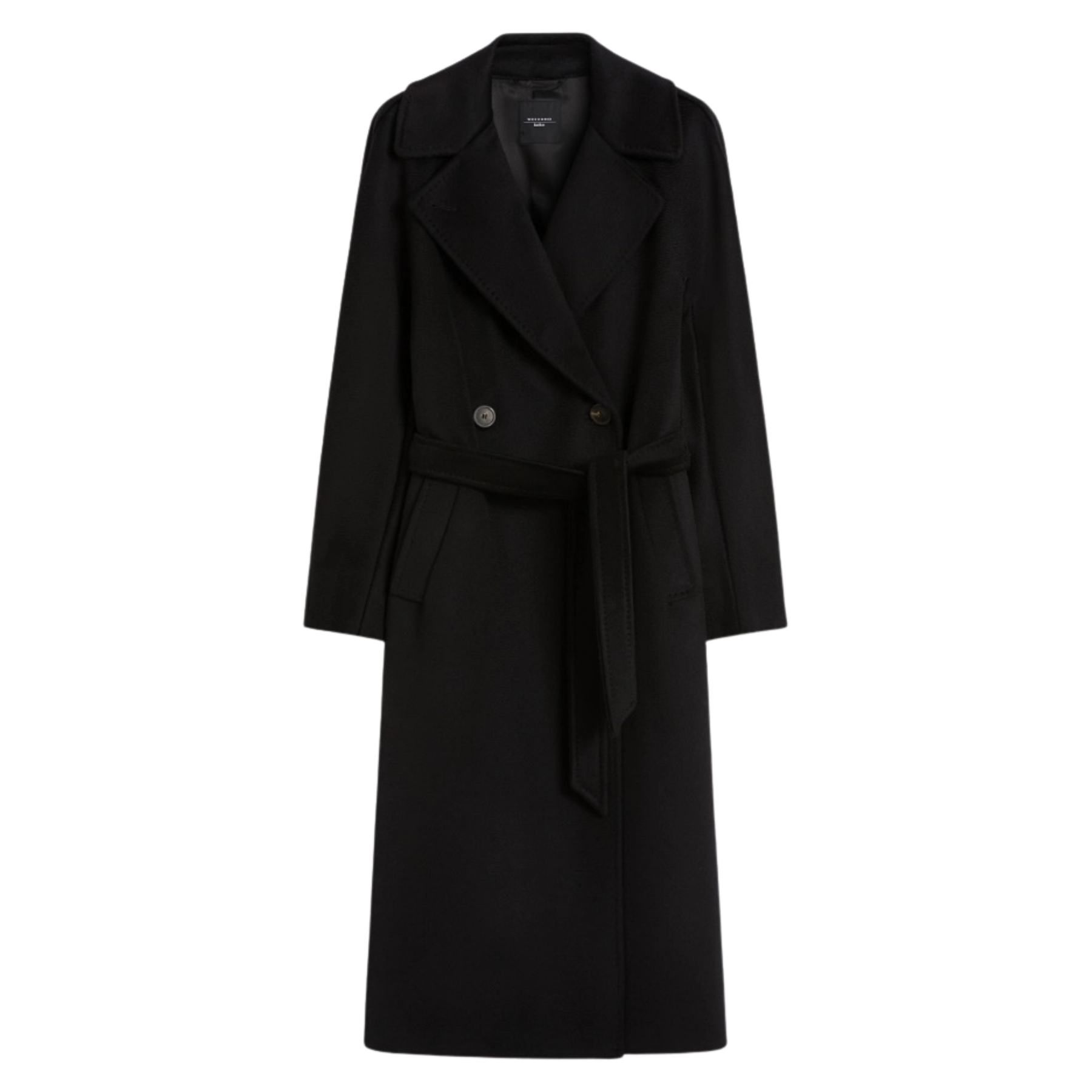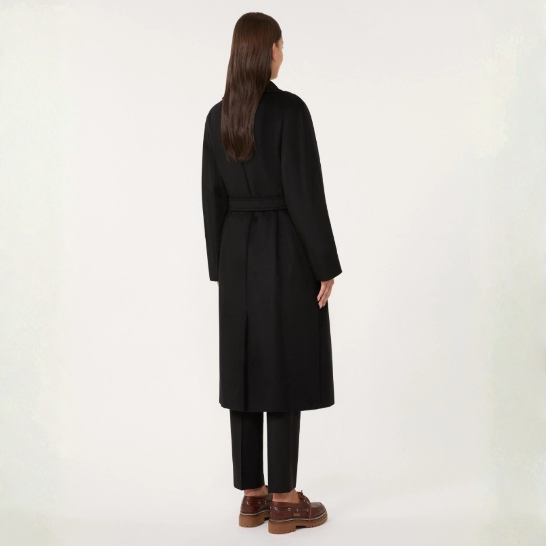 Denne sorte kåpen fra Max Mara er definert av rene snitt og tydelig struktur. Den rette silhuetten gir et rolig, gjennomført uttrykk, mens det matchende beltet i livet lar deg forme passformen etter ønske.