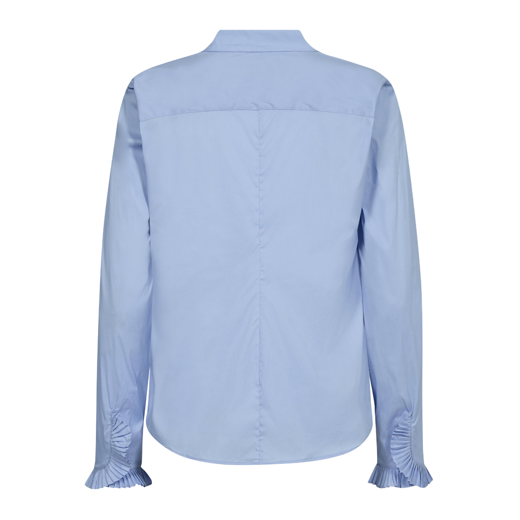 En tidløs skjorte med en flatterende innsvinget fasong som fremhever silhuetten på en subtil måte. Den sofistikerte V‑halsen går over i en delikat knappelukking, mens den stående kragen tilfører et elegant og raffinert preg. Små volangmansjetter gir en myk, feminin detalj som løfter skjorten og gir den det lille ekstra.