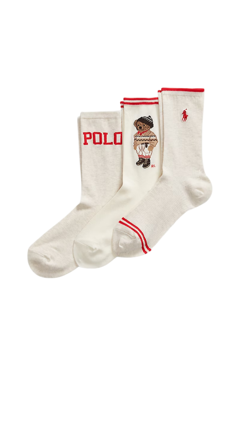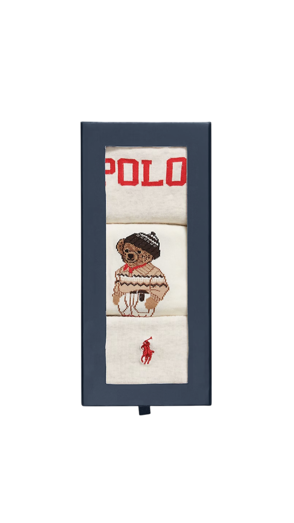 Dette myke settet i bomullsblanding presenteres i en signaturgaveeske og inneholder tre par crew-sokker: ett med Polo Bear, ett med et geometrisk motiv og ett med klassisk stripete kant.