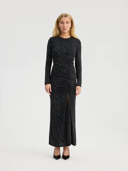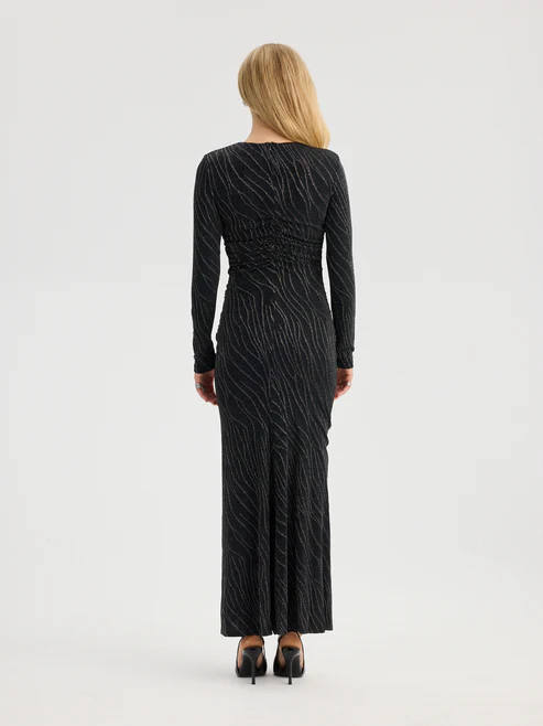 Graceful with a touch of bold radiance, this black-and-gold dress captures a perfect balance of drama and sophistication. Crafted from a shimmering blend of polyester, lurex, and elastane, it glitters beautifully with every movement—its golden threads subtly woven through the deep black base for a luxurious, luminous effect. The long, elegant silhouette drapes smoothly along the body, while structured shoulder pads add a modern, empowered edge that elevates the look.