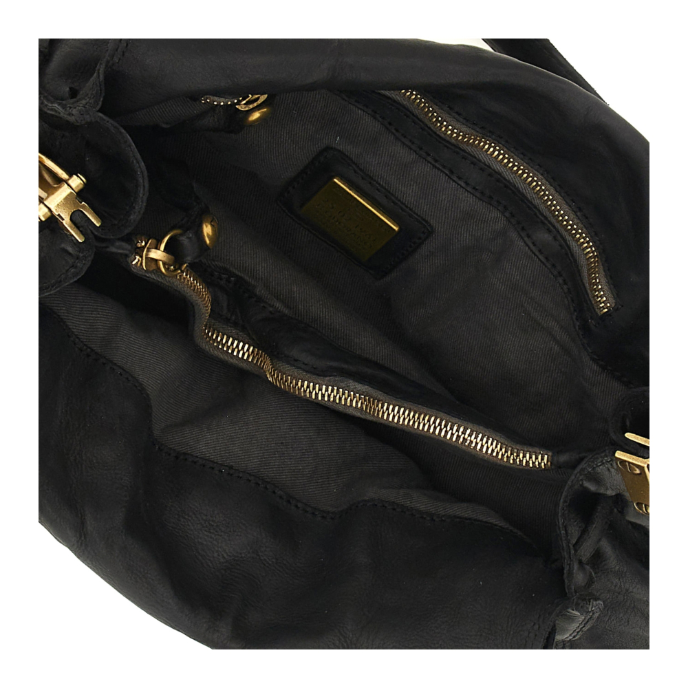 En liten og gjennomført veske i sort, vegetabilsk garvet kuskinn. Modellen har et strukturert uttrykk og praktisk inndeling med tre rom innvendig, hvorav ett lukkes med glidelås. I tillegg har den én åpen innerlomme. Vesken lukkes med magnetisk klikklås.