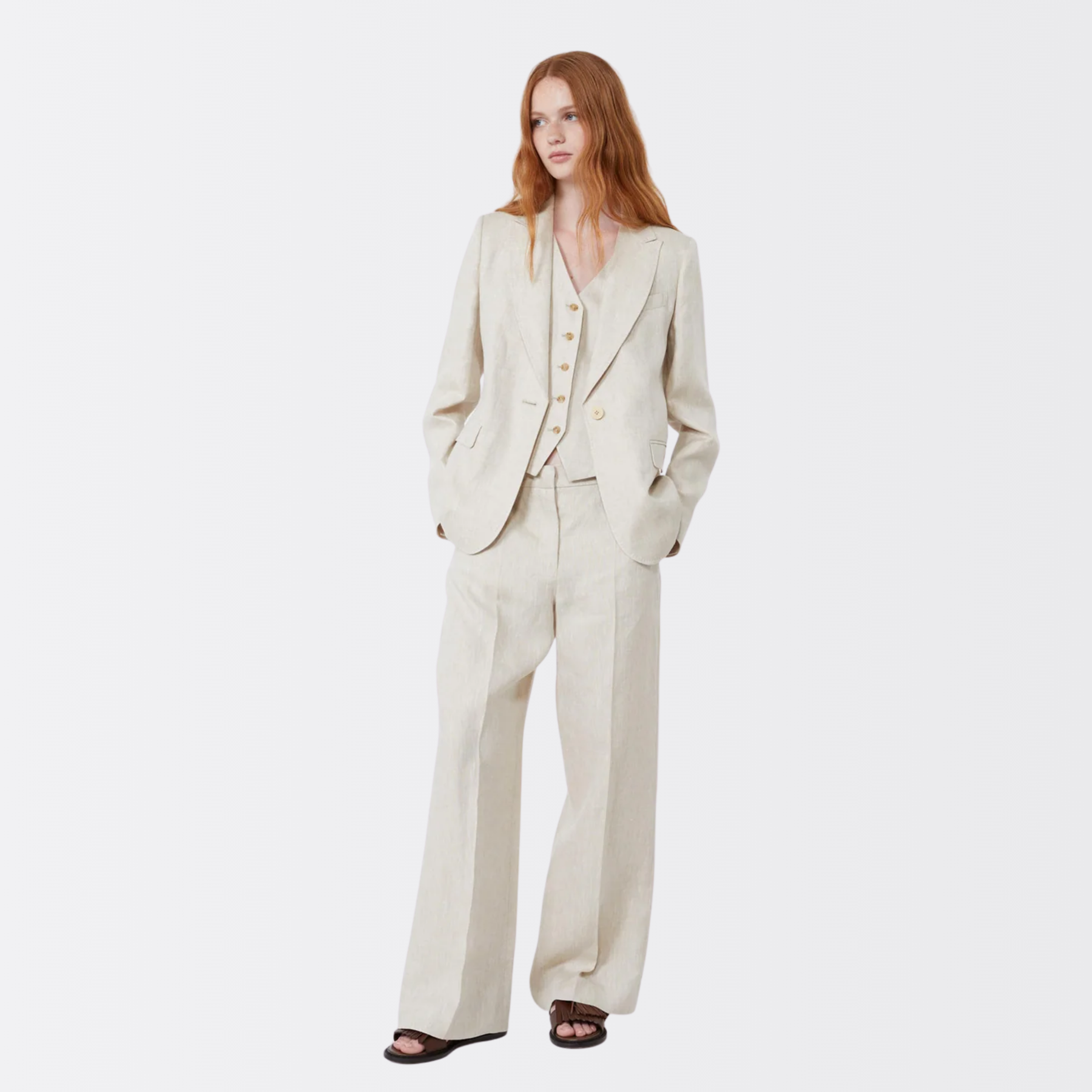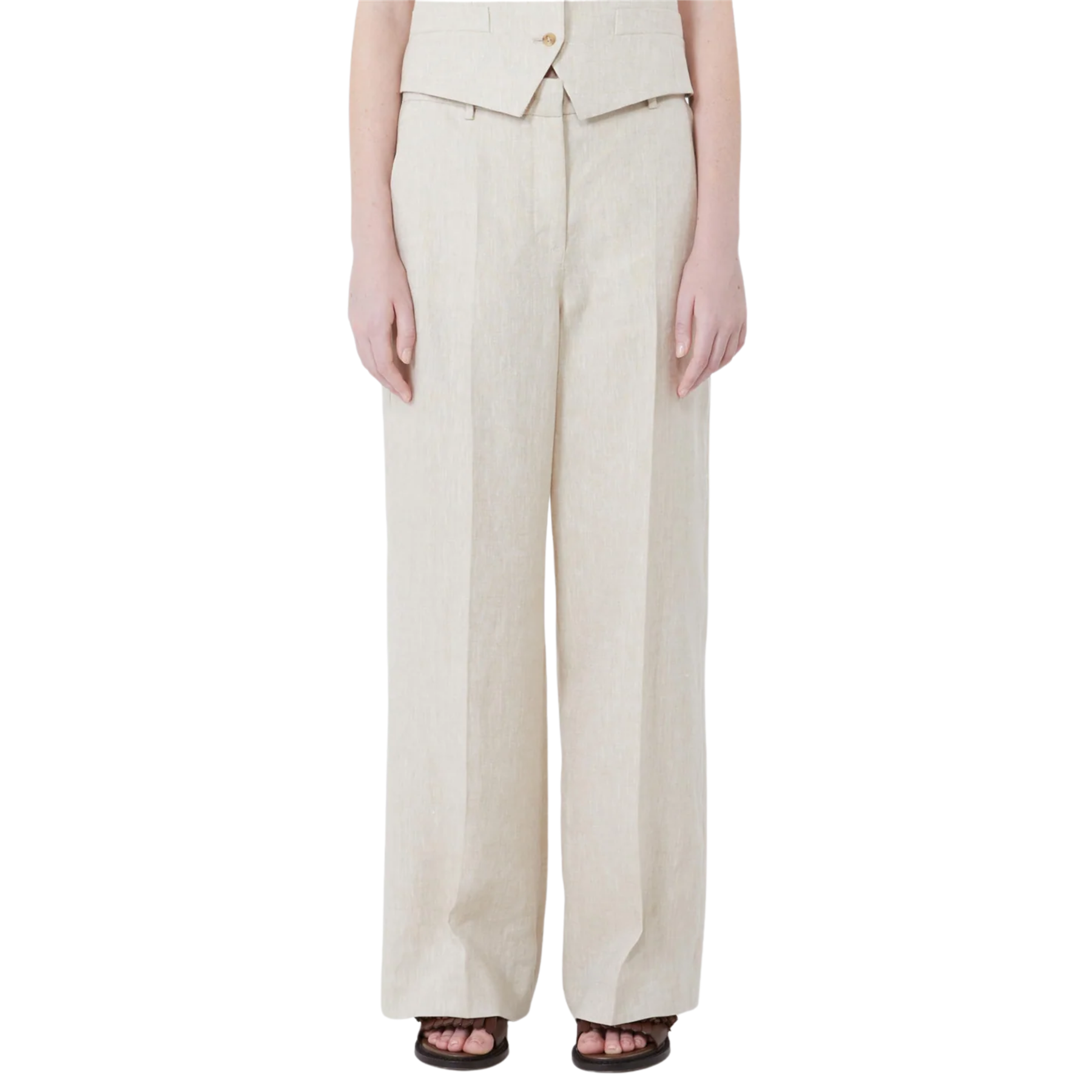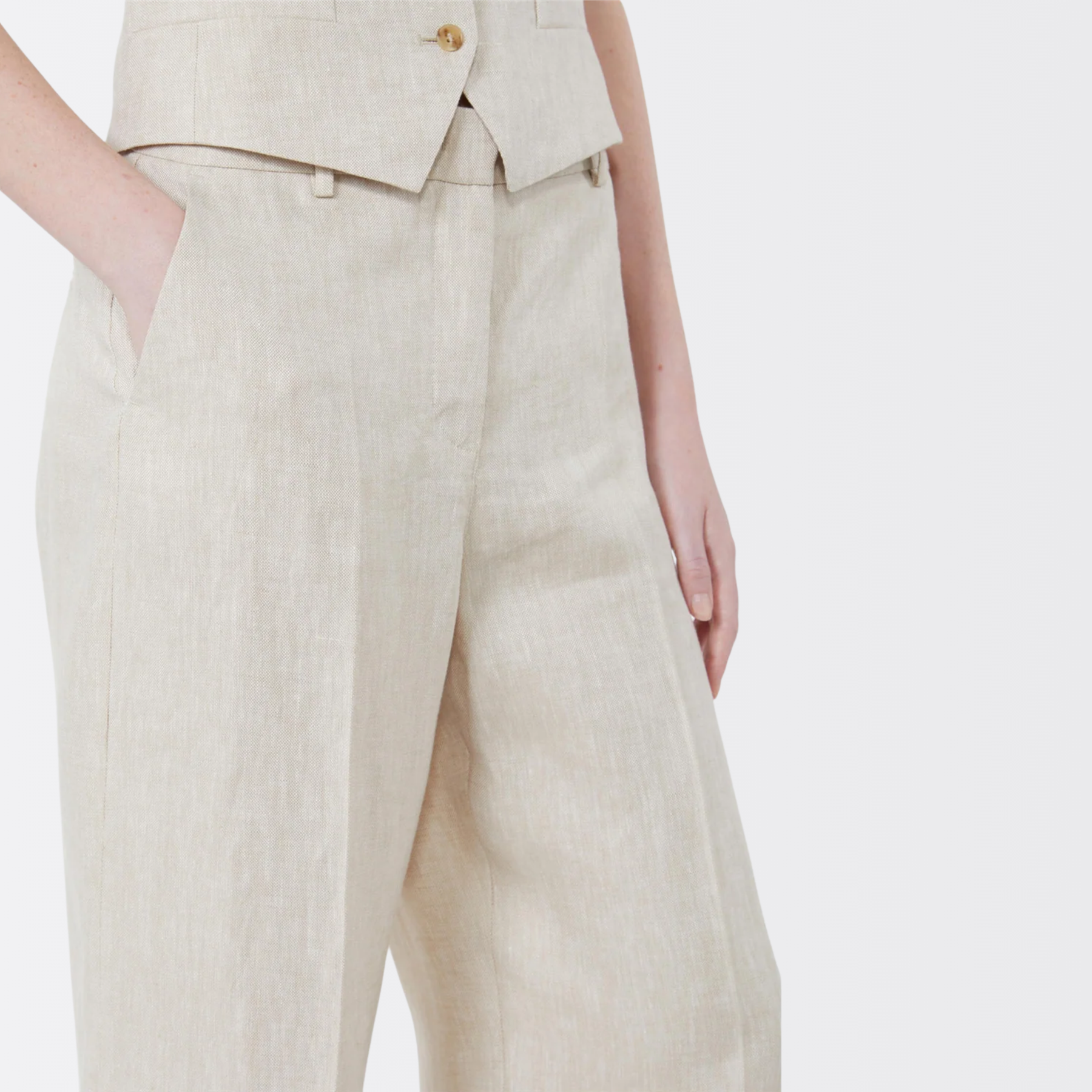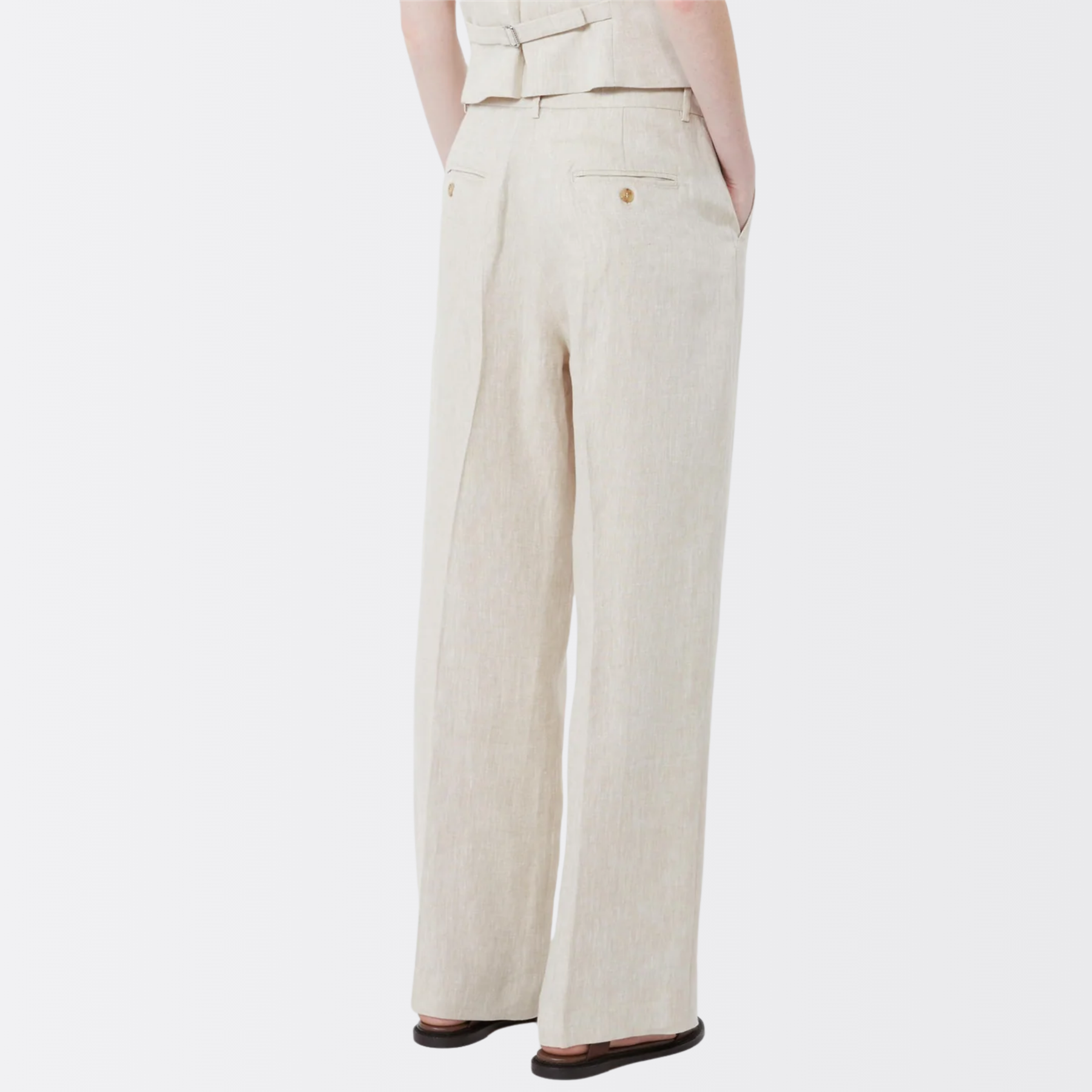 Disse linbuksene fra Max Mara har vide, rette ben med pressfold som gir en flott definert silhuett og lett volum. Buksen har normal passform, skrå sidelommer og baklommer med knapp, samt sydde legg bak i livet som gir et elegant fall. Midjen lukkes med bred knappestolpe, glidelås og liten hempe, og den rene linlerreten gjør buksen både lett og pustende. Et tidløst plagg som fungerer like godt med den matchende blazeren, som til en enkel t-skjorte – perfekt for kontor eller stilfulle hverdagsantrekk.