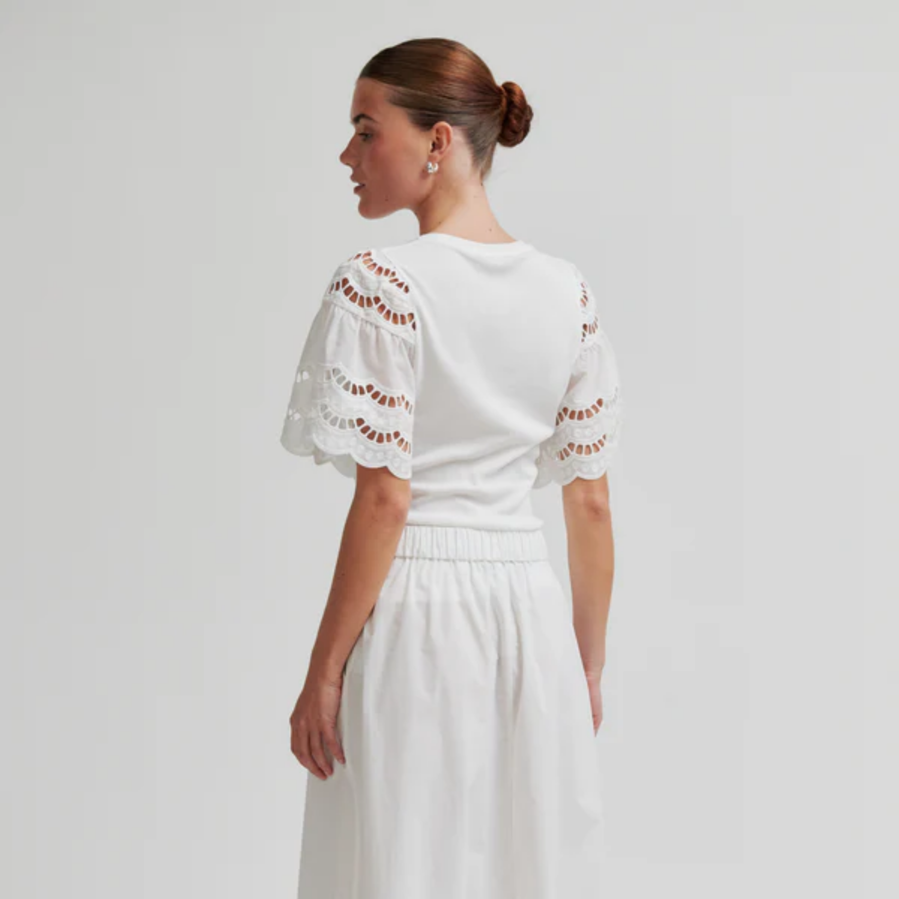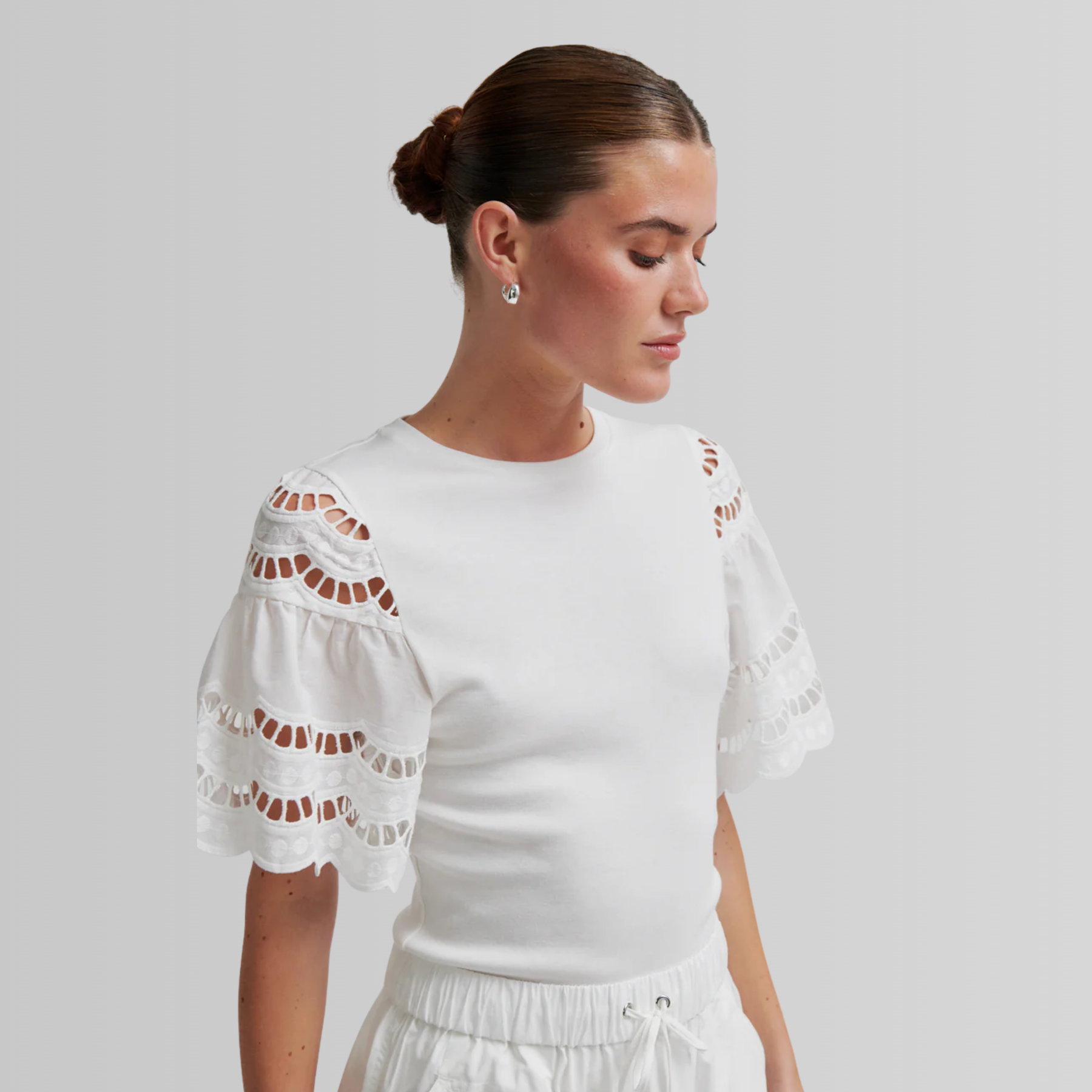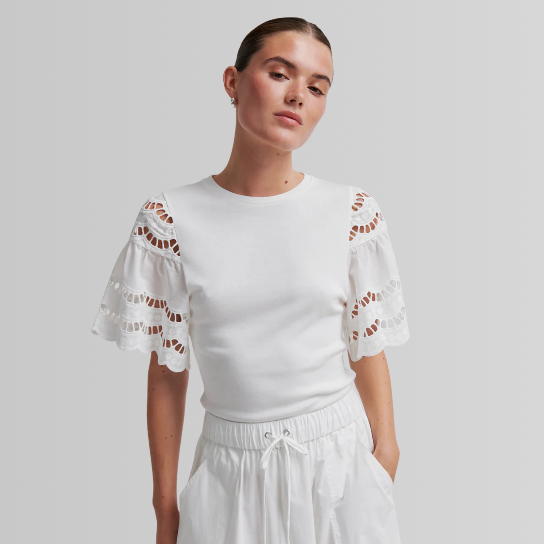 T-skjorte i bomulls- og modalblanding med blondedetaljer på ermene – en feminin vri på et klassisk baseplagg som fungerer både til hverdags og mer pyntede anledninger.