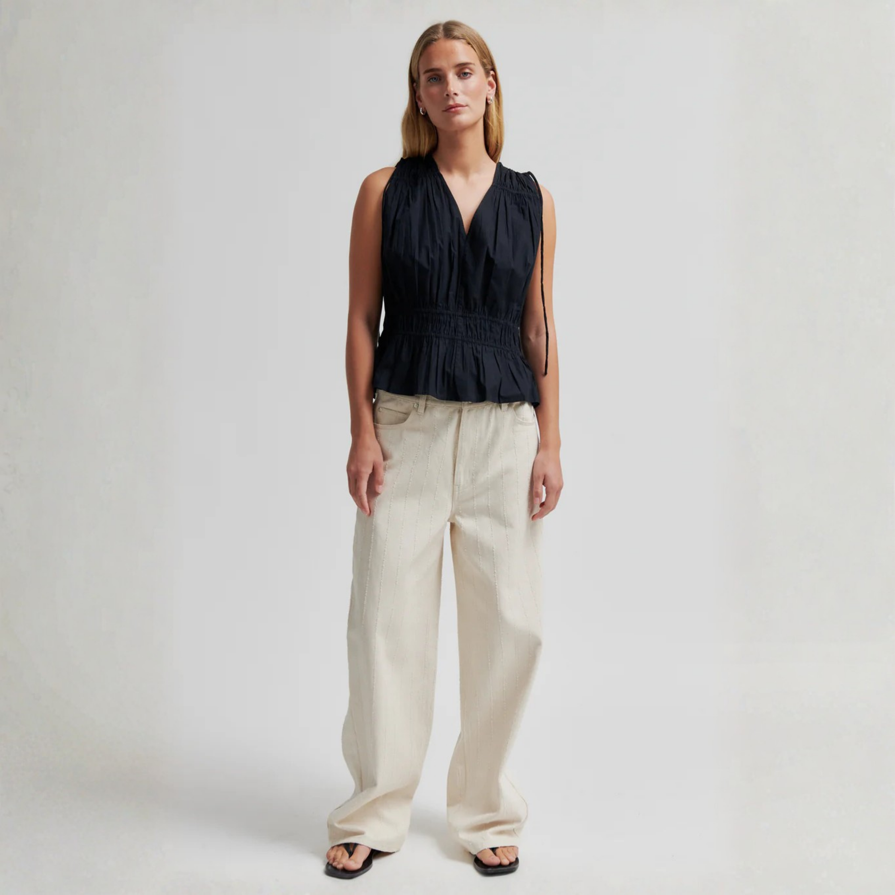 Ermeløs peplumtopp i bomull med V-hals og knyting på skuldrene – en lett og feminin topp med markert midje og fine detaljer.