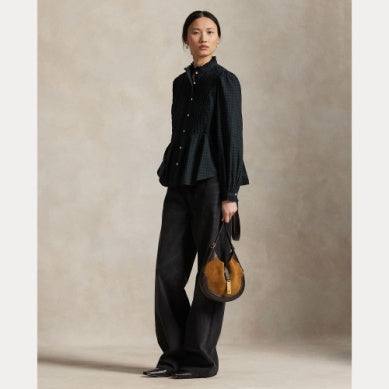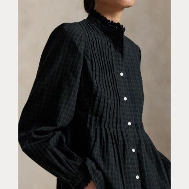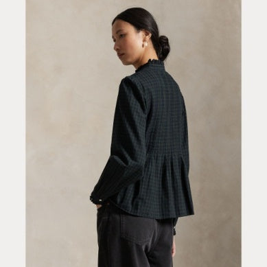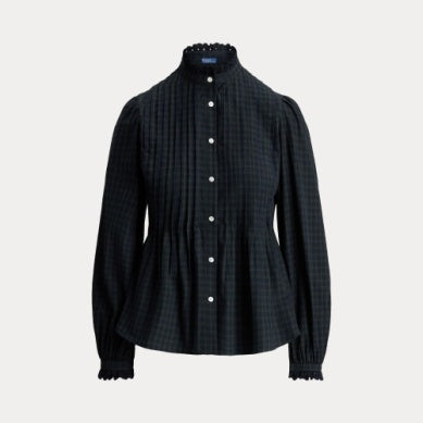Denne skjorten er vevd med garnfarget rutete bomull og kombinerer en peplum-silhuett med pintucking langs overdelen foran og bak. Den er detaljert med hullbroderi på den høye kragen og mansjettene.