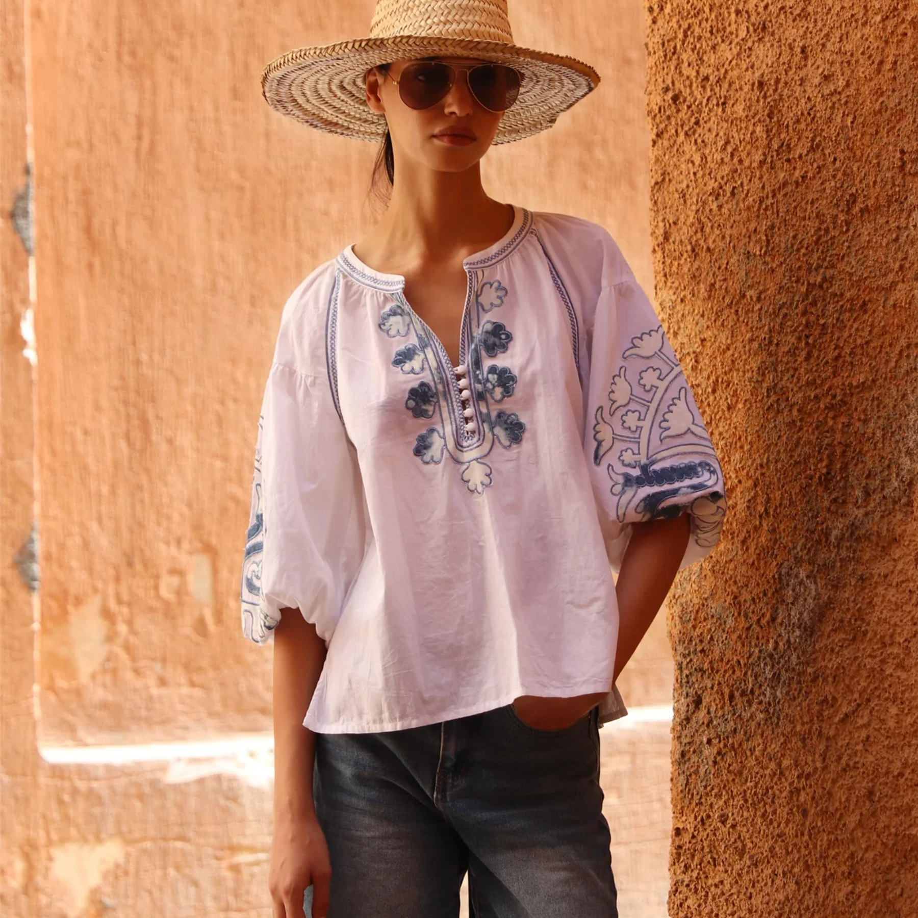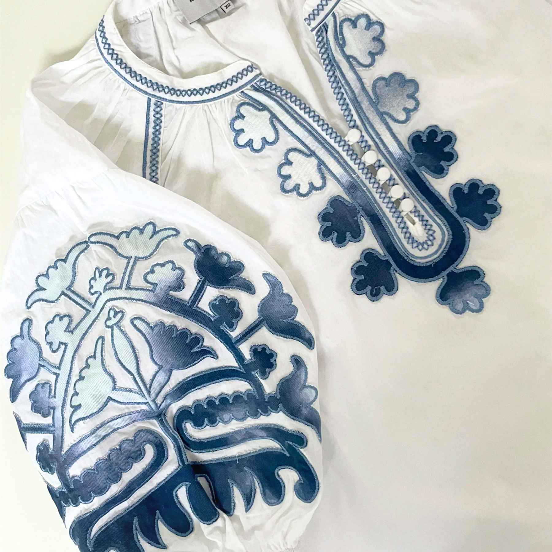 En topp med et særpreg som er vanskelig å kopiere. Den hvite bomullspoplinen er lett og fin, mens de håndklipte denim-applikasjonene og dekorative sømmer i myk denimblå gjør den til noe helt for seg selv. De elastiske blouson-ermene i trekvartlengde gir et avslappet og luftig uttrykk uten at det blir uformelt.