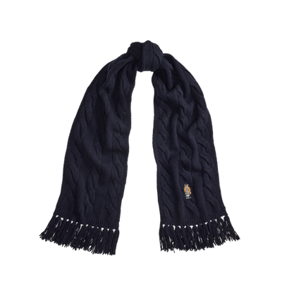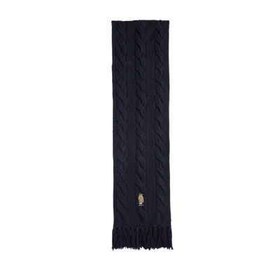 Dette kabelstrikkede skjerfet fra Polo Ralph Lauren er laget i en varm blanding av merinoull og nylon, med myk tekstur og strukturert strikk som gir både komfort og eleganse. Skjerfet er dekorert med en brodert Polo Bear og “Polo”-logo i den ene enden, og kantet med frynser som tilfører en subtil, avslappet detalj.