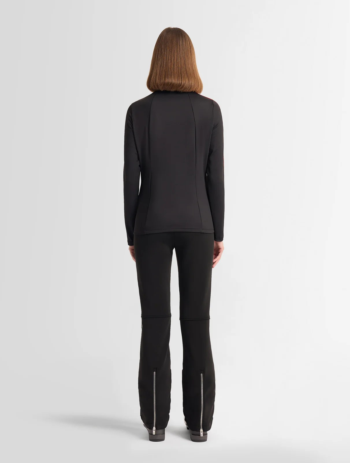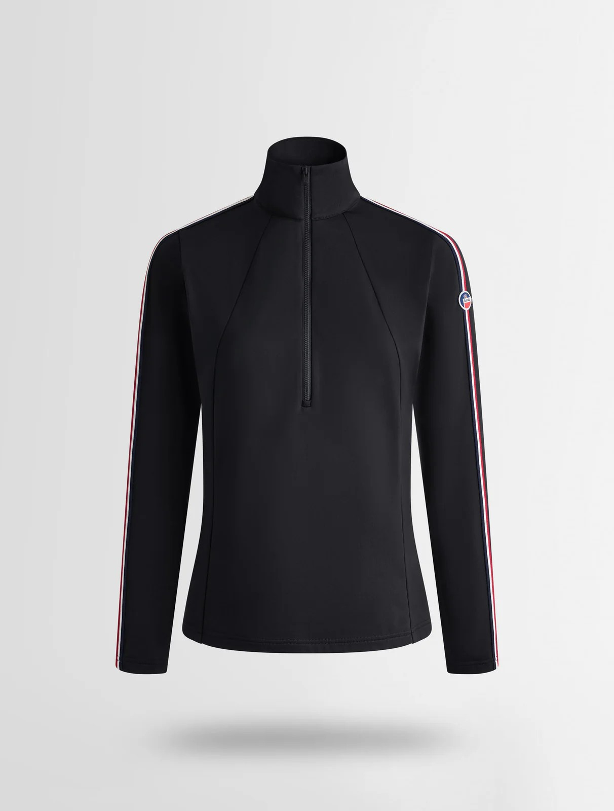 Stellia-termiske laget frister med sitt ikoniske utseende. Den er laget av børstet Powerstretch-stoff med stående krage og flerfarget strikk langs ermene. En garderobe som lett kan gli under en genser eller en lett jakke.