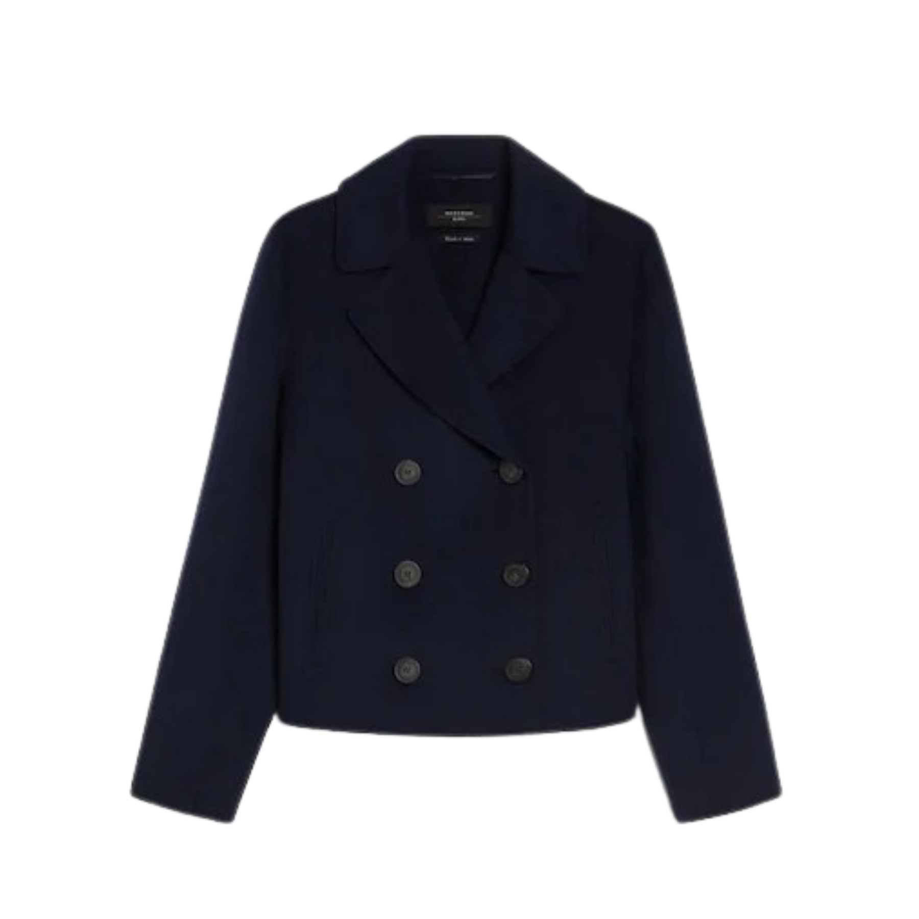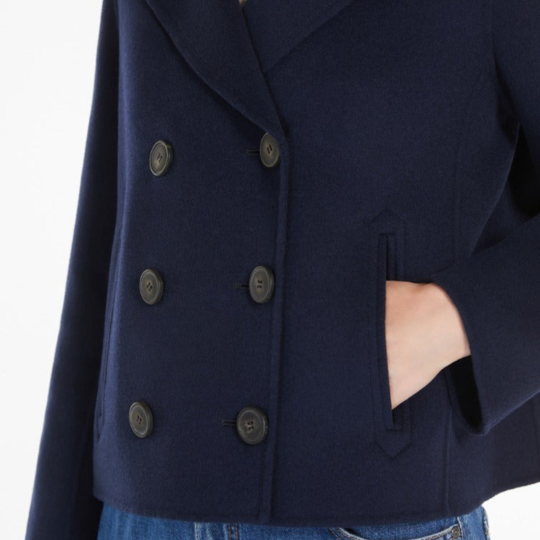 Kort peacoat i fint håndsydd tosidig ren ullstoff. Den klassiske dobbeltsnappede designen har en jakkekrage, lange innsatte ermer og vertikale passpolerte lommer. Uforet modell. Knappefeste foran.
