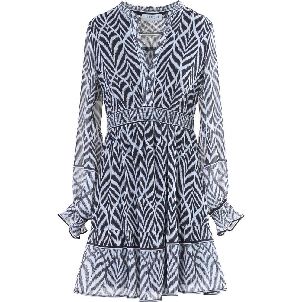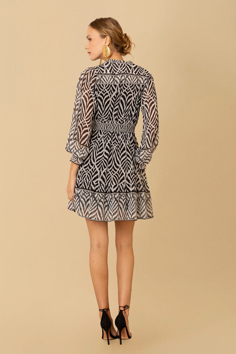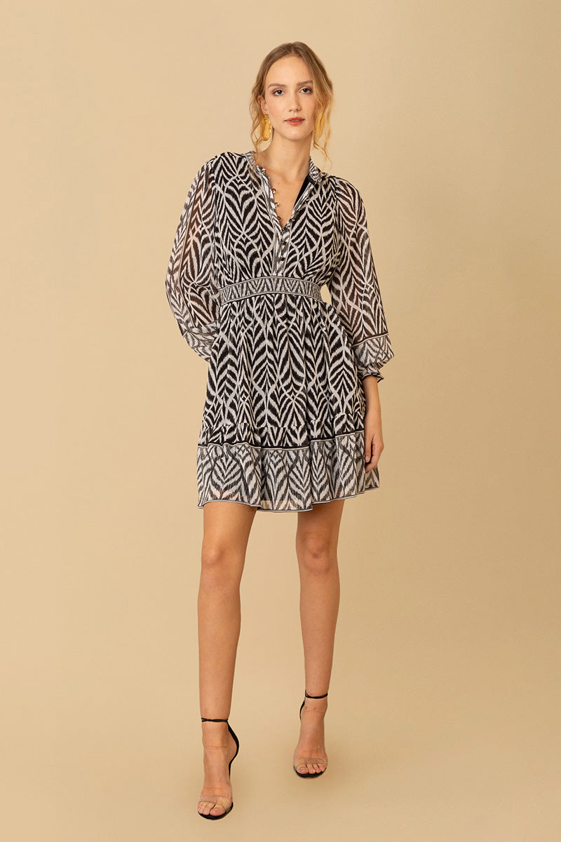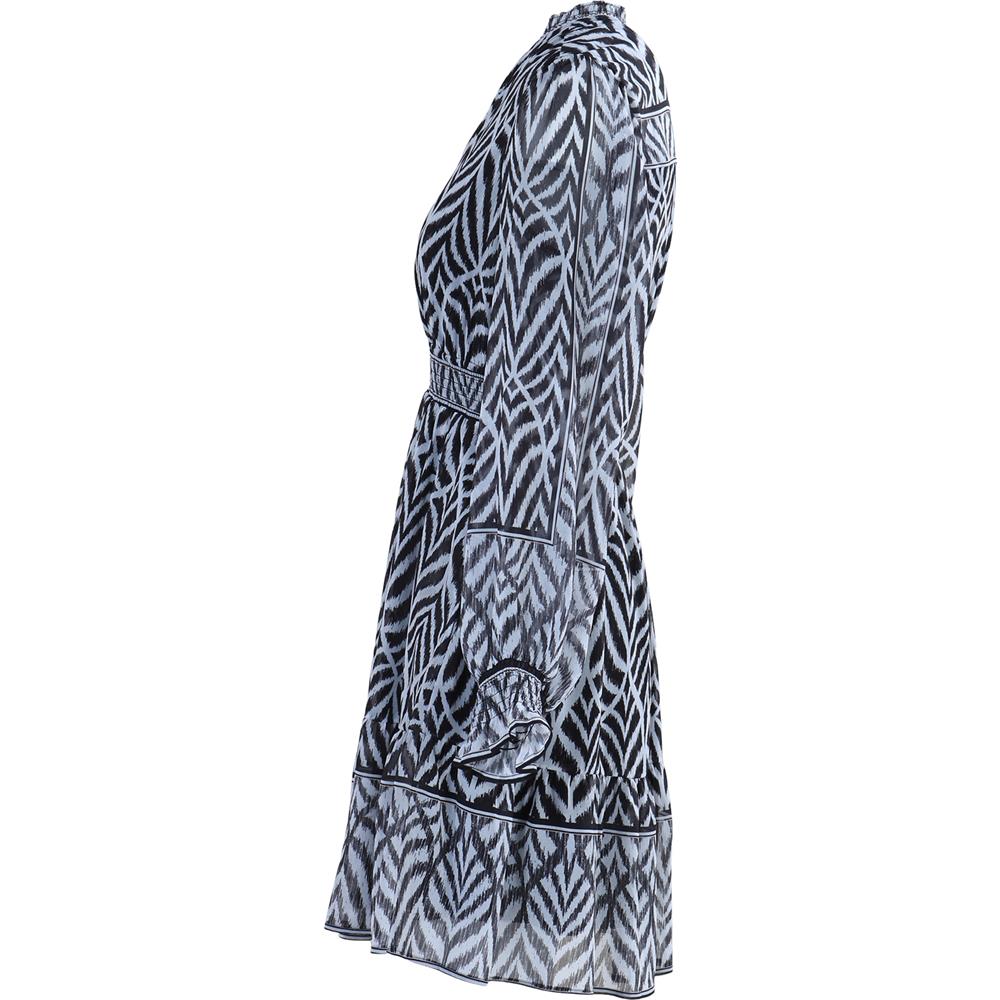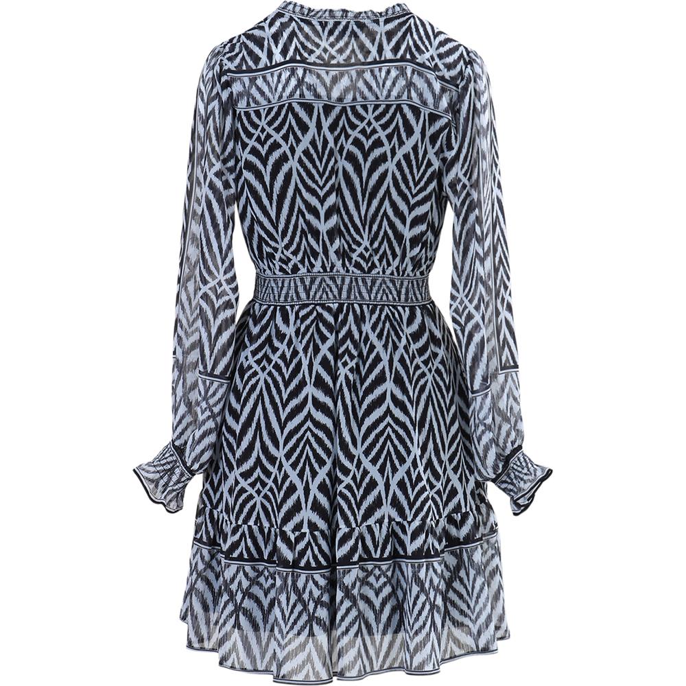 Feminin kjole med smocking og volanger – detaljer som smocking rundt hals og midje, knappelukking foran, lommer i sidene og volangtier nederst gir et elegant uttrykk.