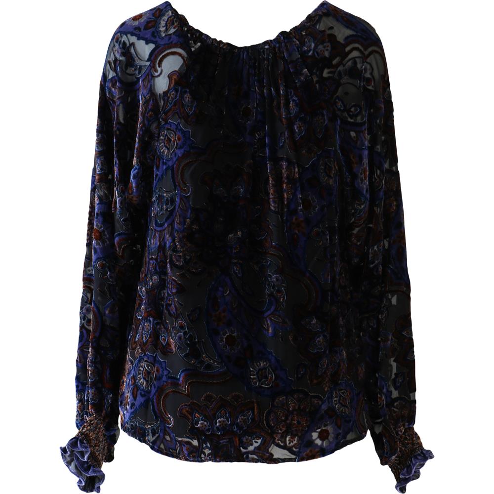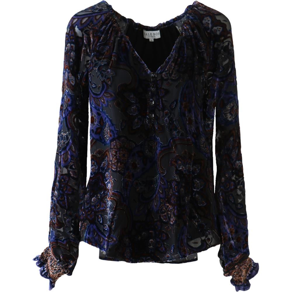 Bluse i silkeblanding med burnout-effekt – foret med jerseylinning, fine legg i hals og ermer, knapp foran. Materiale: 60 % silke / 40 % viskose. Kun rens.