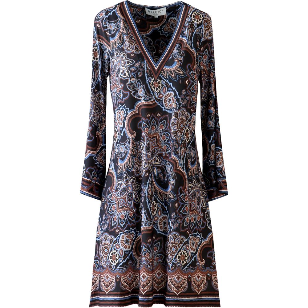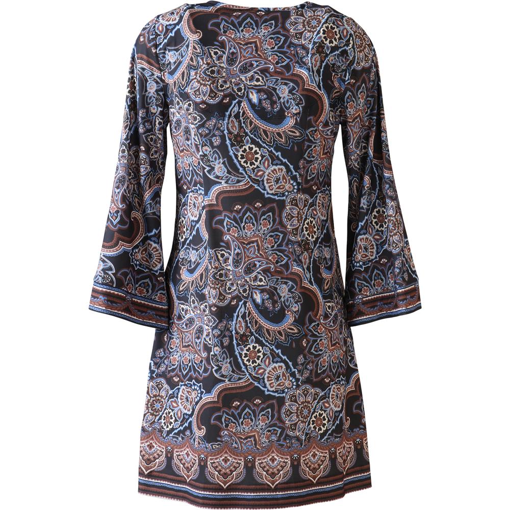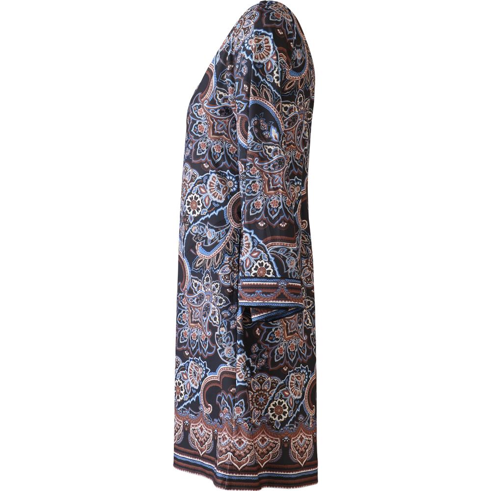 Denne A-formede kjolen kombinerer smal passform over brystet med vid 3/4-erm, og har praktiske lommer i sidene. Lengden går over kneet, og den stretchy jerseykvaliteten gir komfort hele dagen. Perfekt for både hverdags og fest.
