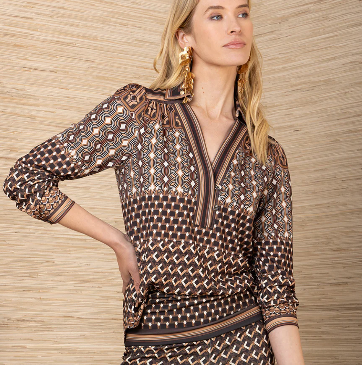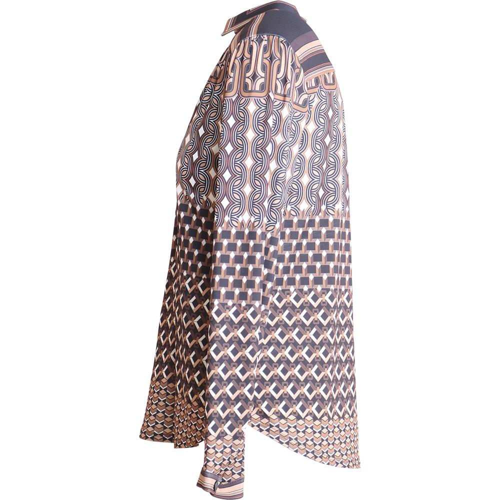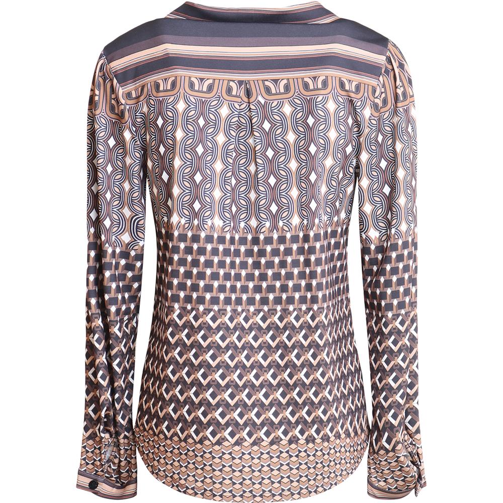 Moderne og elegant bluse fra Hale Bob med klassisk krage og knappelukking foran. Lange ermer med smockmansjett og hoftelengde gir en feminin silhuett, mens det lekre mønsteret i svart og brun tilfører et sofistikert preg.